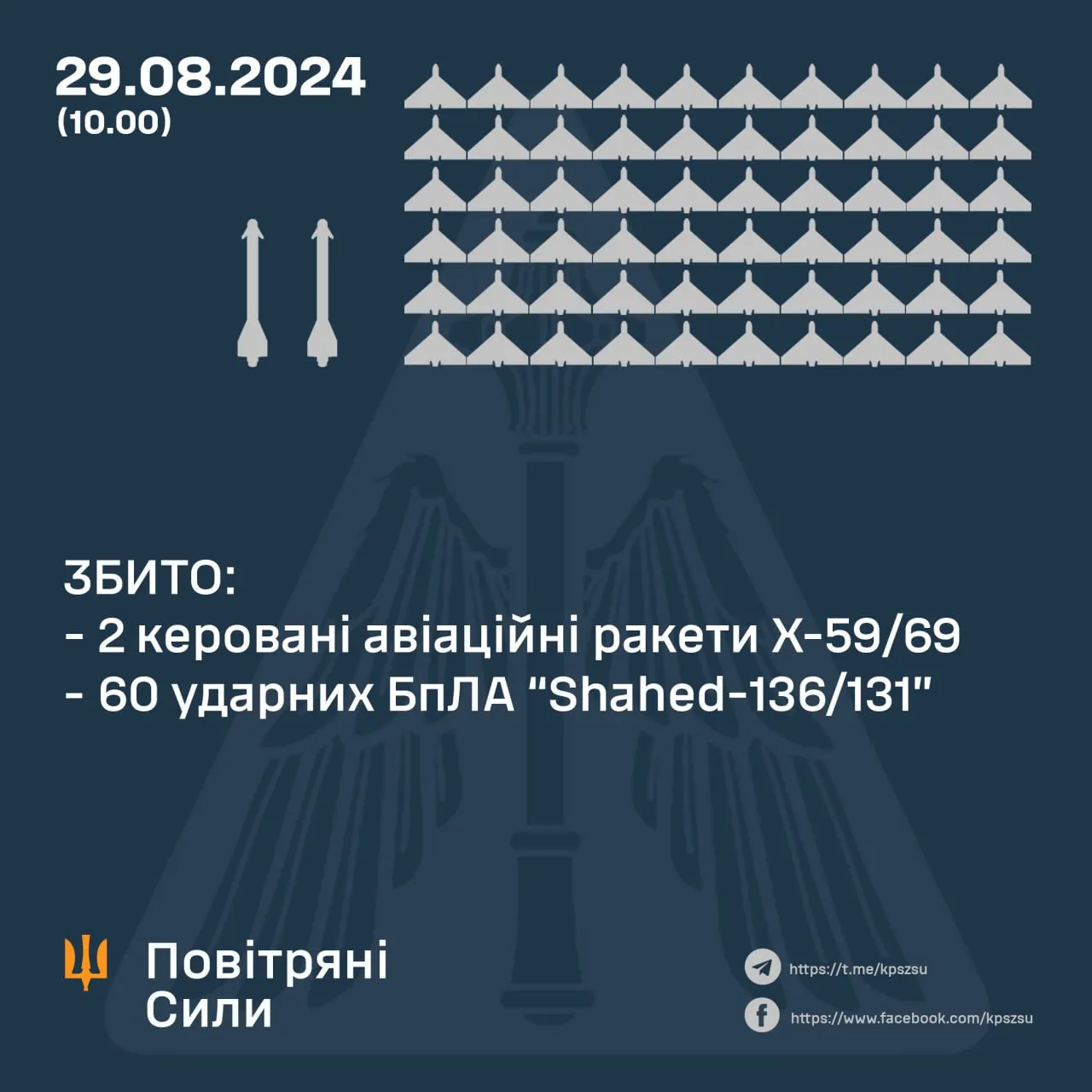 В ночь на 29 августа Россия атаковала Украину тремя управляемыми авиационными ракетами Х-59/69 из воздушного пространства Курской и Белгородской областей в России. Командующий Воздушных сил Николай Олещук сообщил, что с этого же направления враг атаковал 2 ракетами. По его словам, тип этих ракет сейчас устанавливается.
