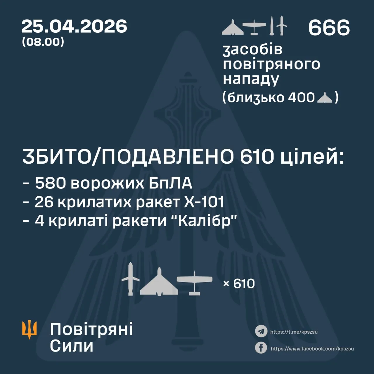 По состоянию на 08:00 силы ПВО уничтожили или подавили 610 воздушных целей: 30 ракет и 580 беспилотников разных типов. Среди них – 26 крылатых ракет Х-101 и 4 ракеты "Калибр".