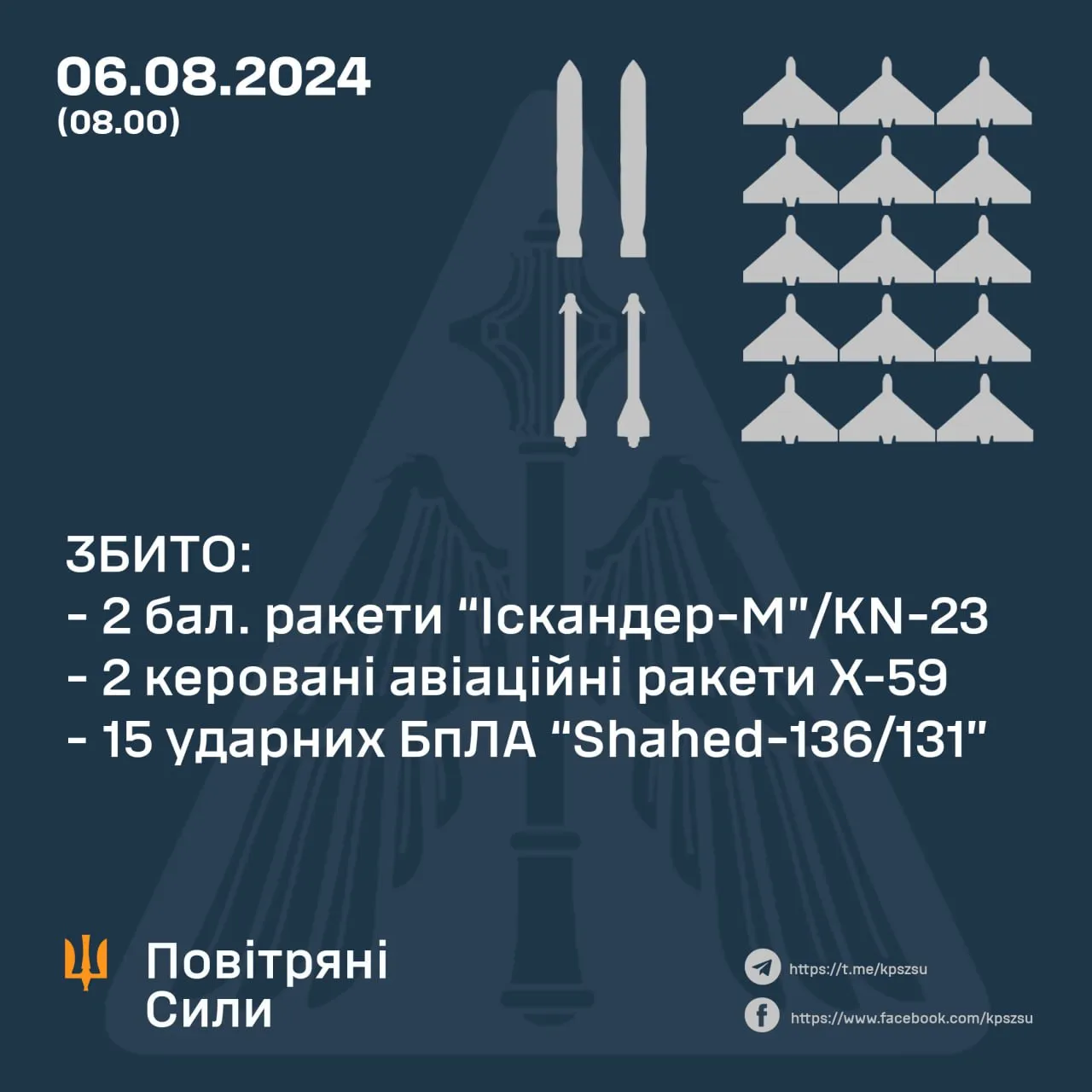 В результате противовоздушного боя сбиты две баллистические ракеты "Искандер-М"/KN-23, две управляемые авиационные ракеты Х-59 и 15 ударных БПЛА в Киевской, Херсонской, Николаевской и Хмельницкой областях,