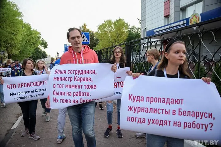 - Белорусские журналисты собрались под зданием Министерства внутренних дел, чтобы поговорить с министром. Одна из причин – задержание их коллег.