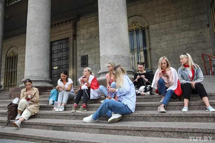 - Еще один интересный способ протеста придумали минские митингующие. Они собрались на ступенях Национального художественного музея, где вместе вязали бело-красно-белые флаги.