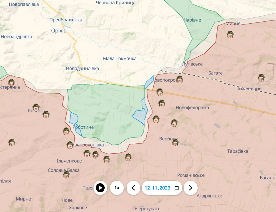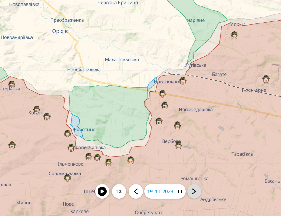 В то же время российские войска пытаются вернуть себе утраченные позиции на восточных краях этого участка – между селами Новопокровка и Вербовое.