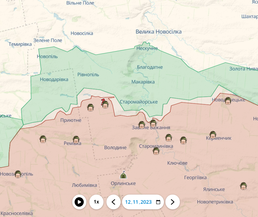Так, российские войска пытаются бить с северо-запада в сторону Старомайорского. И на прошлой неделе, к сожалению, у врага были некоторые успехи – он смог приблизиться к дороге, которая ведет из Ровнополя в Старомайорское.