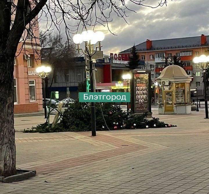 Из-за сильного ветра в некоторых городах России попадали новогодние елки. Как сообщили местные жители Курска, там 13 декабря елка упала на проспекте Дериглазова.