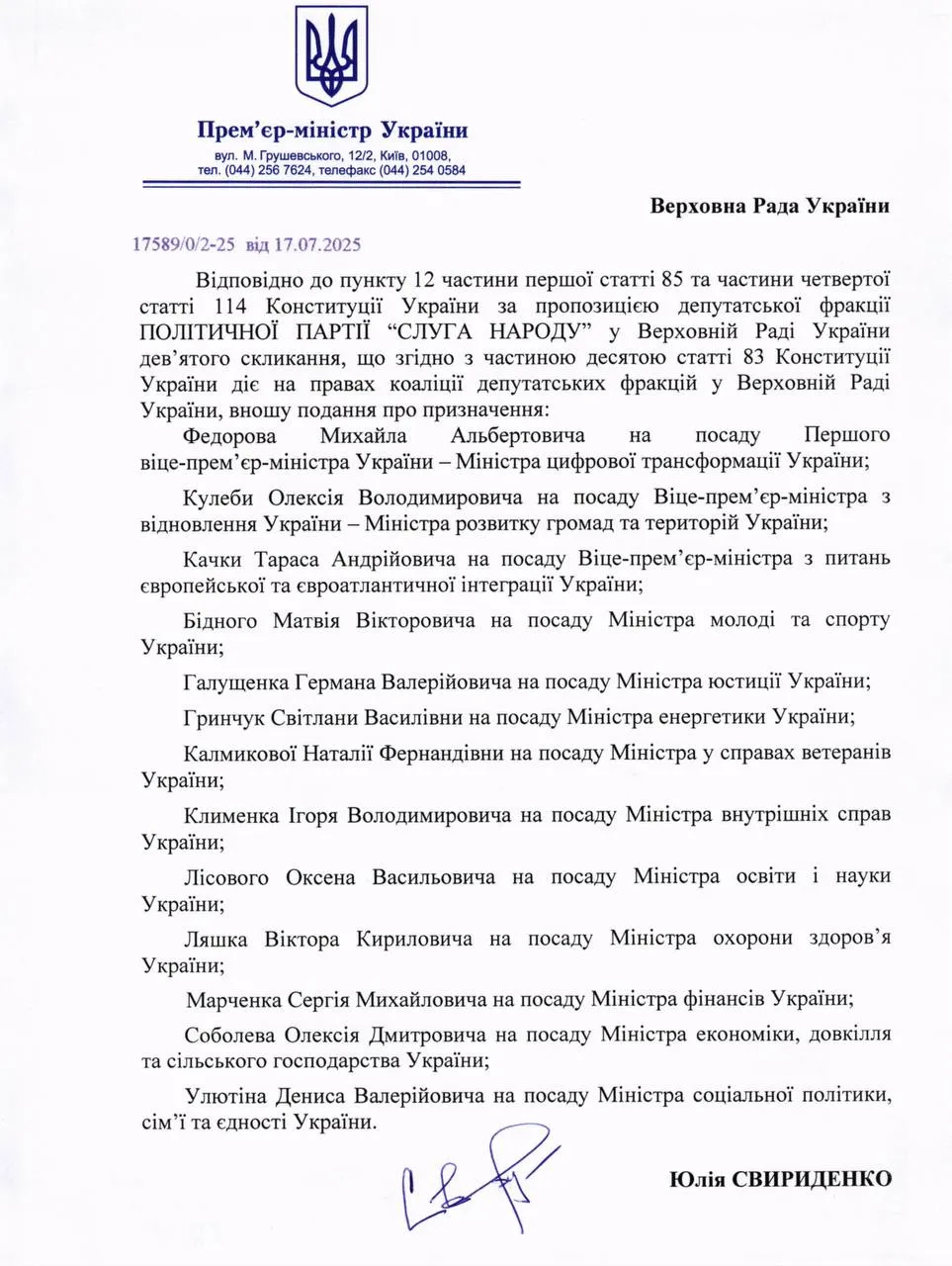 В представлении в Верховную Раду Юлия Свириденко внесла таких кандидатов в министры: