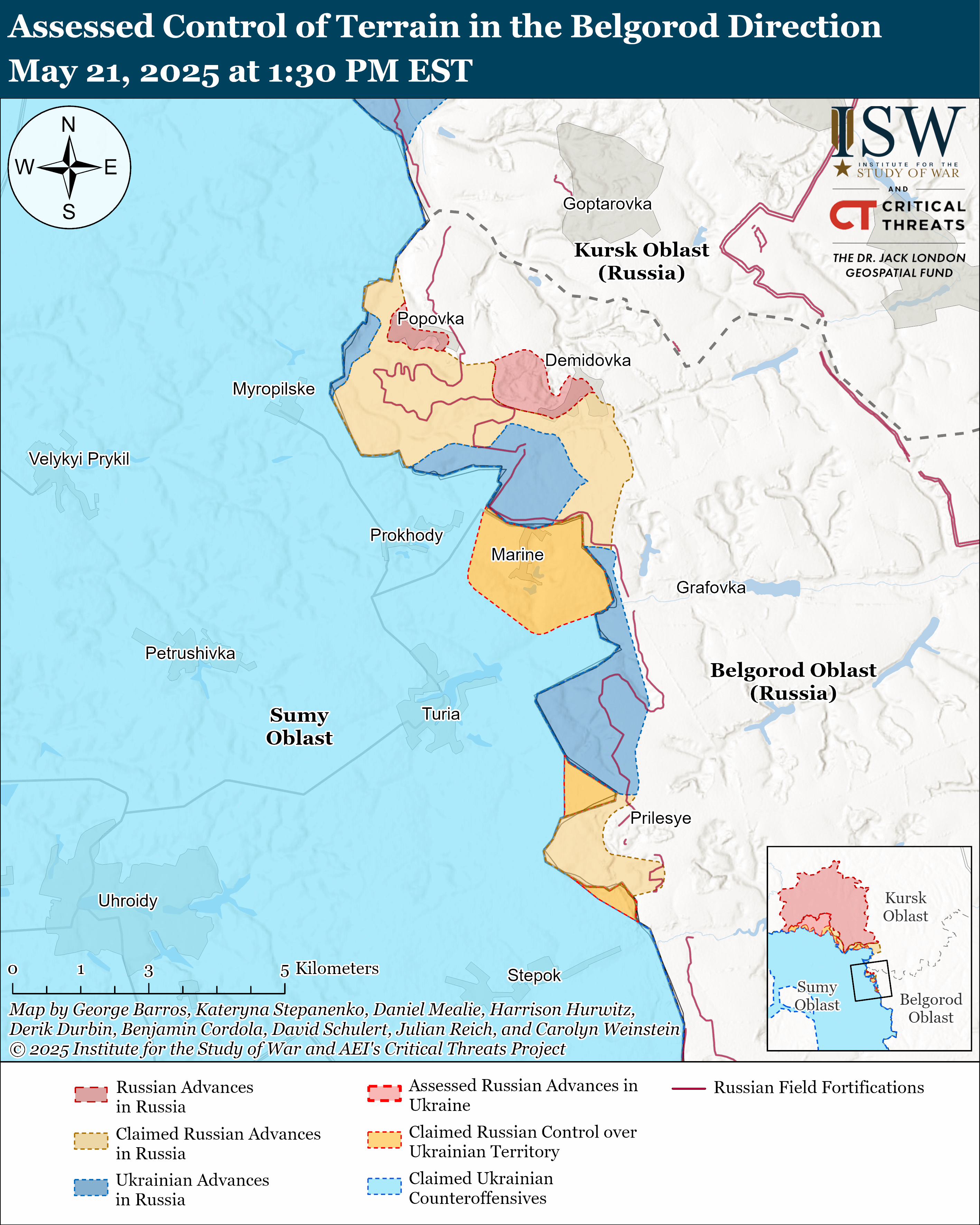 - 21 мая российские источники заявили, что украинская диверсионно-разведывательная группа (ДРГ) вошла в Брянскую область, причем аж за более чем 70 километров от границы. Речь идет о поселениях Субботово и Мякишево к юго-западу от Брянска и о Суземском (к югу от Брянска) и Трубчевском (к юго-западу от города) районах. ISW не обнаружил доказательств этих утверждений.