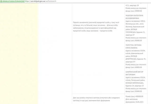 Компания зарегистрирована в Киеве, на ул. Боричев ток, д. 35а. Размер взноса Шафранского в статутный капитал составил 80 тысяч гривен. Он указан среди учредителей компании.