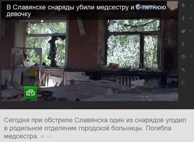 "Сегодня один из снарядов попал в родильное отделение больницы Славянска. Там сейчас что-то вроде военного госпиталя. В отделении не было пациентов, однако дежурил медперсонал. Одна из медсестер скончалась от полученных ранений", — говорится в сообщении на сайте НТВ.