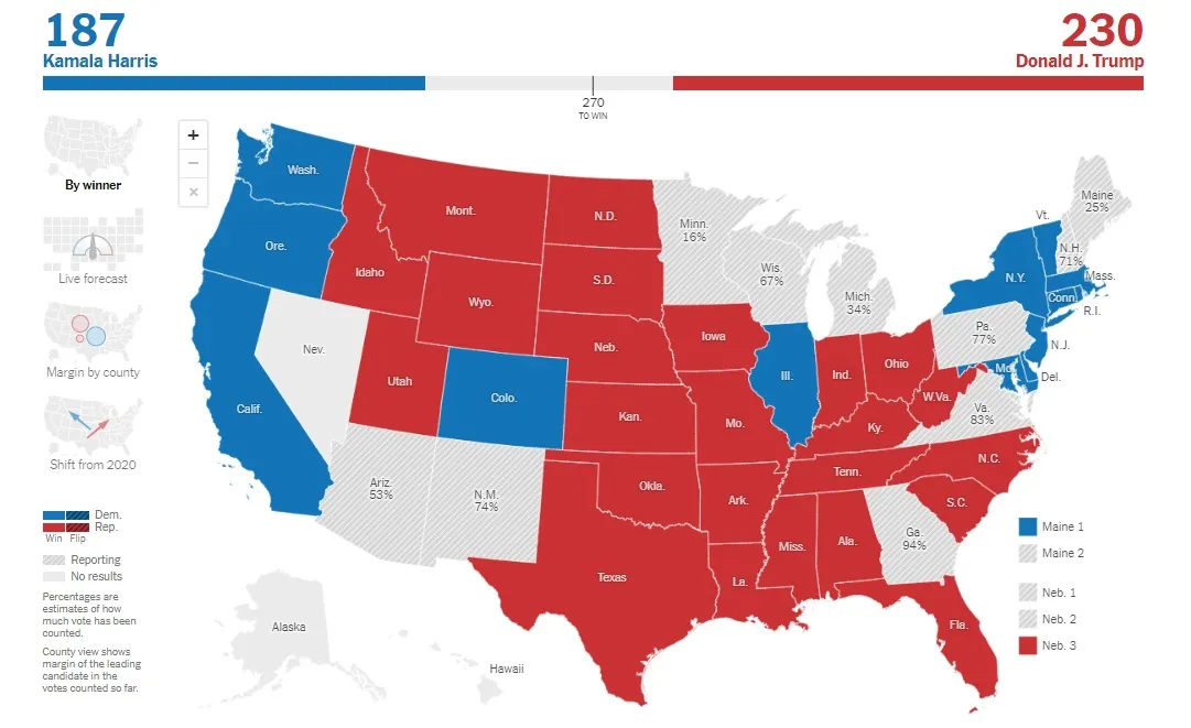 Впрочем, подсчет голосов еще продолжается, поэтому ситуация может измениться в пользу Гаррис.