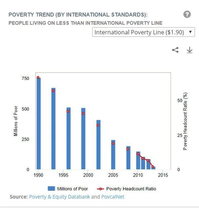 К КНР люди с таким доходом проживают в сельской местности, они потребляют еду (овощи и фрукты) выращенные на своей земле, деньги, которые указаны тут являются скорее всего их доходами с продажи выращенной продукции, но в эти деньги не входят поступления от родственников, работающих в городах и доходы от работы (переработка мусора, уборка улиц, подсобная работа – работа, где зарплата не платиться легально). Одним словом, несмотря на то, что этот показатель кажется мизерным, люди в деревнях не выживают в конкретном смысле этого слова, я написал этот абзац, чтобы прояснить для Вас более точно ту картинку, которая мрачновато кристаллизуется на фоне словосочетания "1,9 долларов ежедневного дохода".