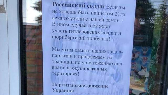 Партизаны на Запорожье оставляют оккупантам послания с призывом возвращаться домой или готовиться к уничтожению на украинской земле так, как раньше подпольщики уничтожали нацистов, передает 24 канал.
