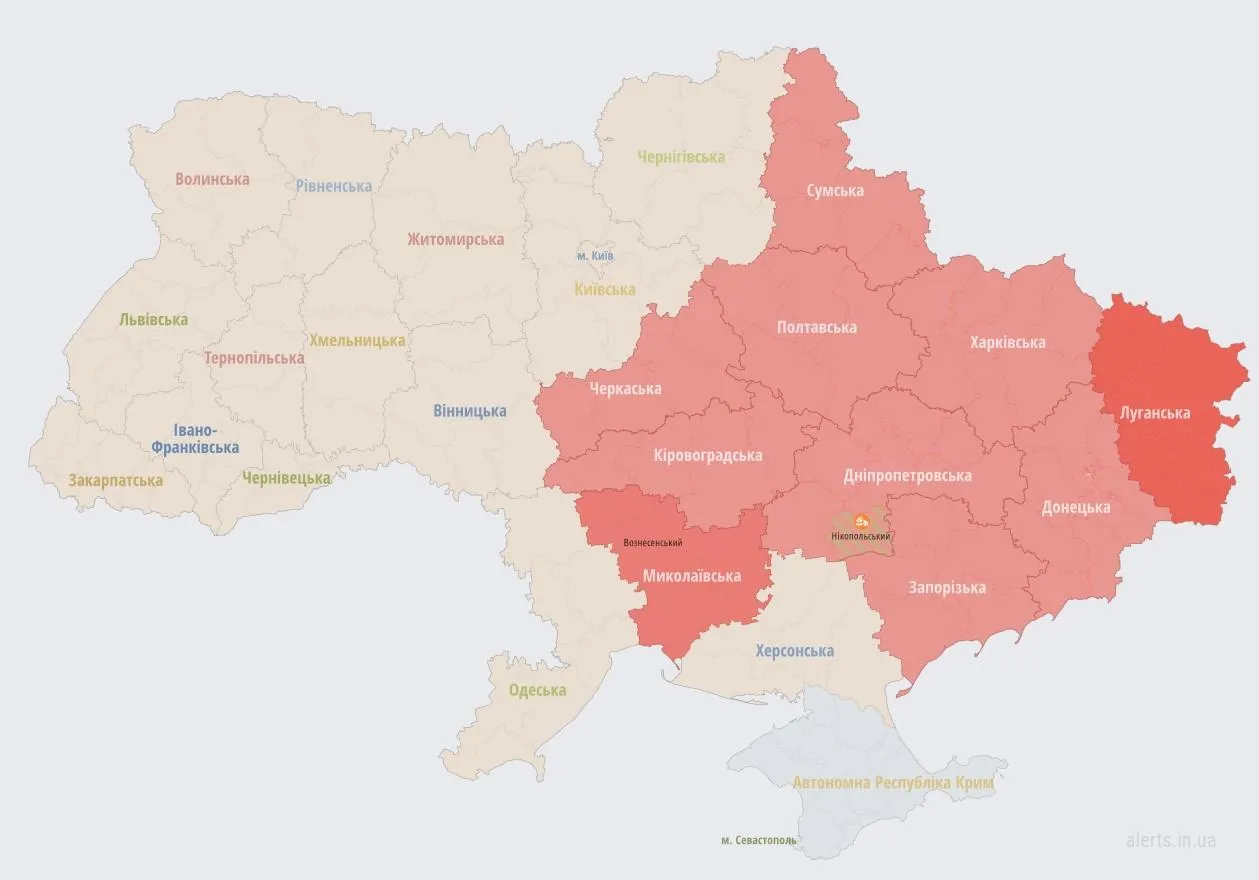 Накануне всеукраинская воздушная тревога и отбои начались в 23 часа. Однако уже через полтора часа снова "покраснели" все восточные, а также часть южных и центральных областей. Отбои начались уже ориентировочно в 00:45.