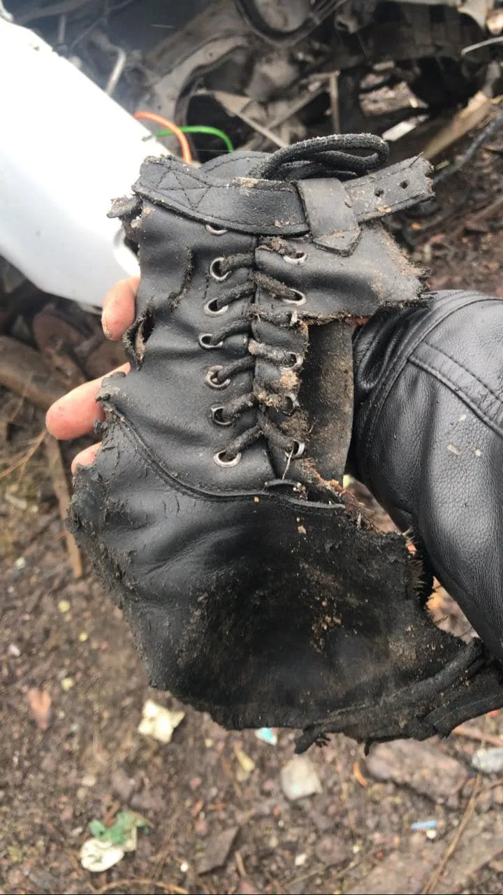 Все, что осталось от оккупанта – уничтоженный ботинок и обломки шлема.