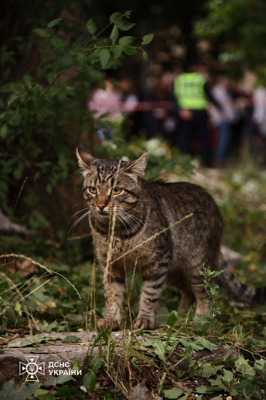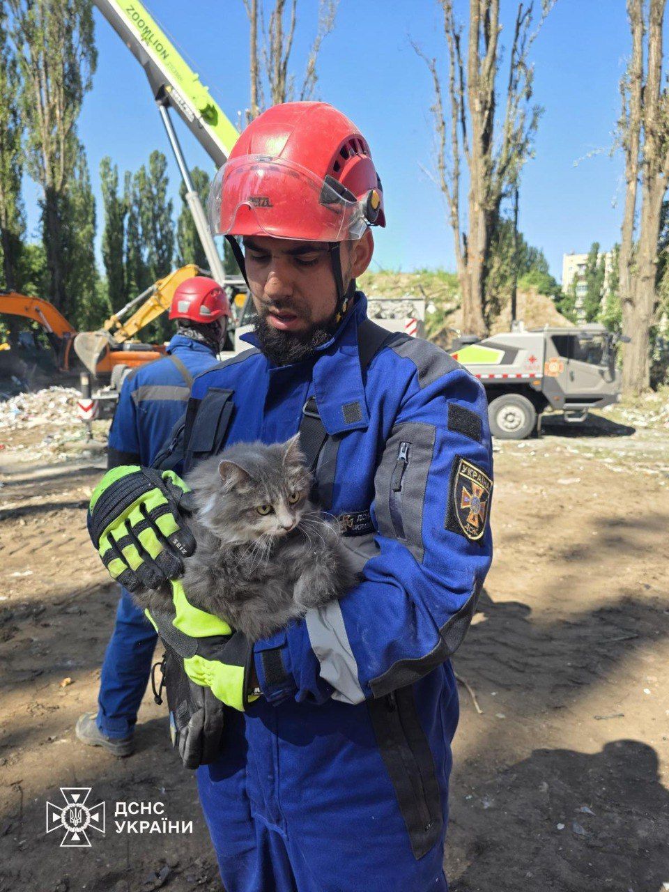 Утром 1 августа на уровне шестого этажа среди обгоревших бетонных плит спасатели достали кота – напуганного, но живого.