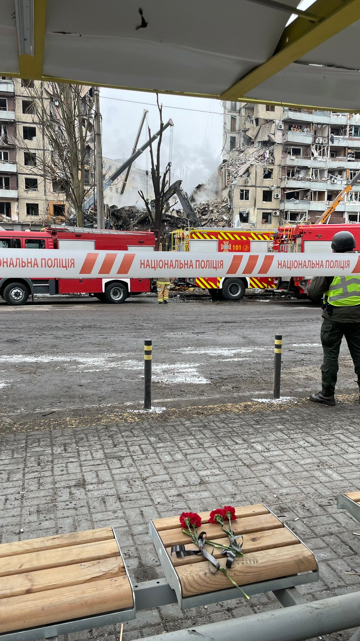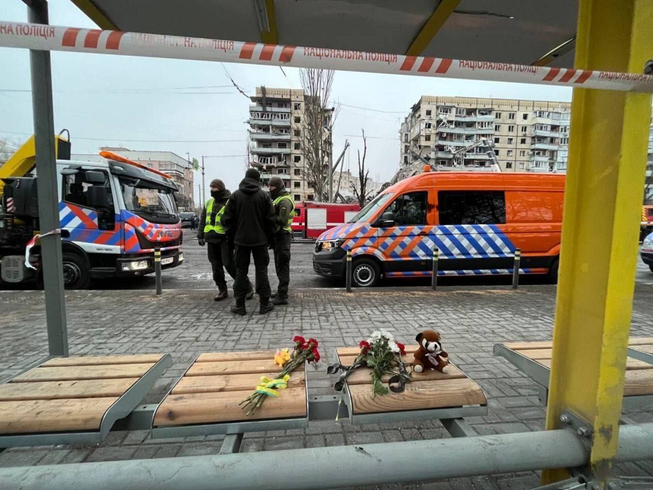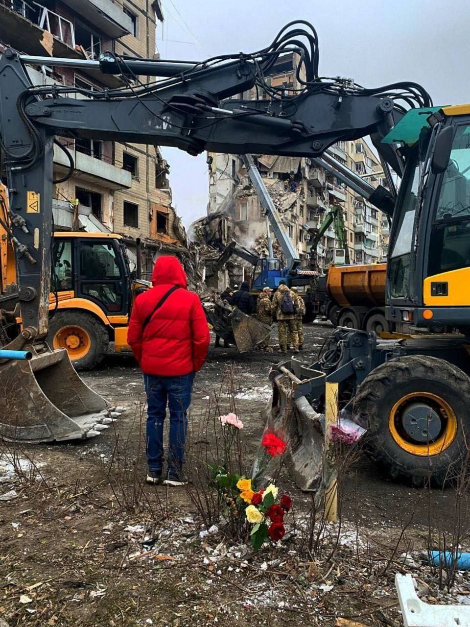 По состоянию на день 15 января на месте разрушенного дома в Днепре находятся бригады спасателей. Они разбирают завалы и ищут тела погибших. В то же время родственники умерших, близкие и просто небезразличные горожане несут к месту трагедии цветы и детские игрушки. Об этом информирует 24 Канал со ссылкой на местные телеграм-каналы.