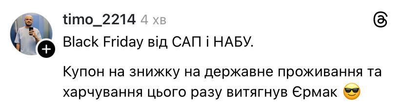 Украинцы связывают обыски у Ермака с "Черной пятницей". Они шутят, что чиновник выиграл скидку на государственное проживание и питание.