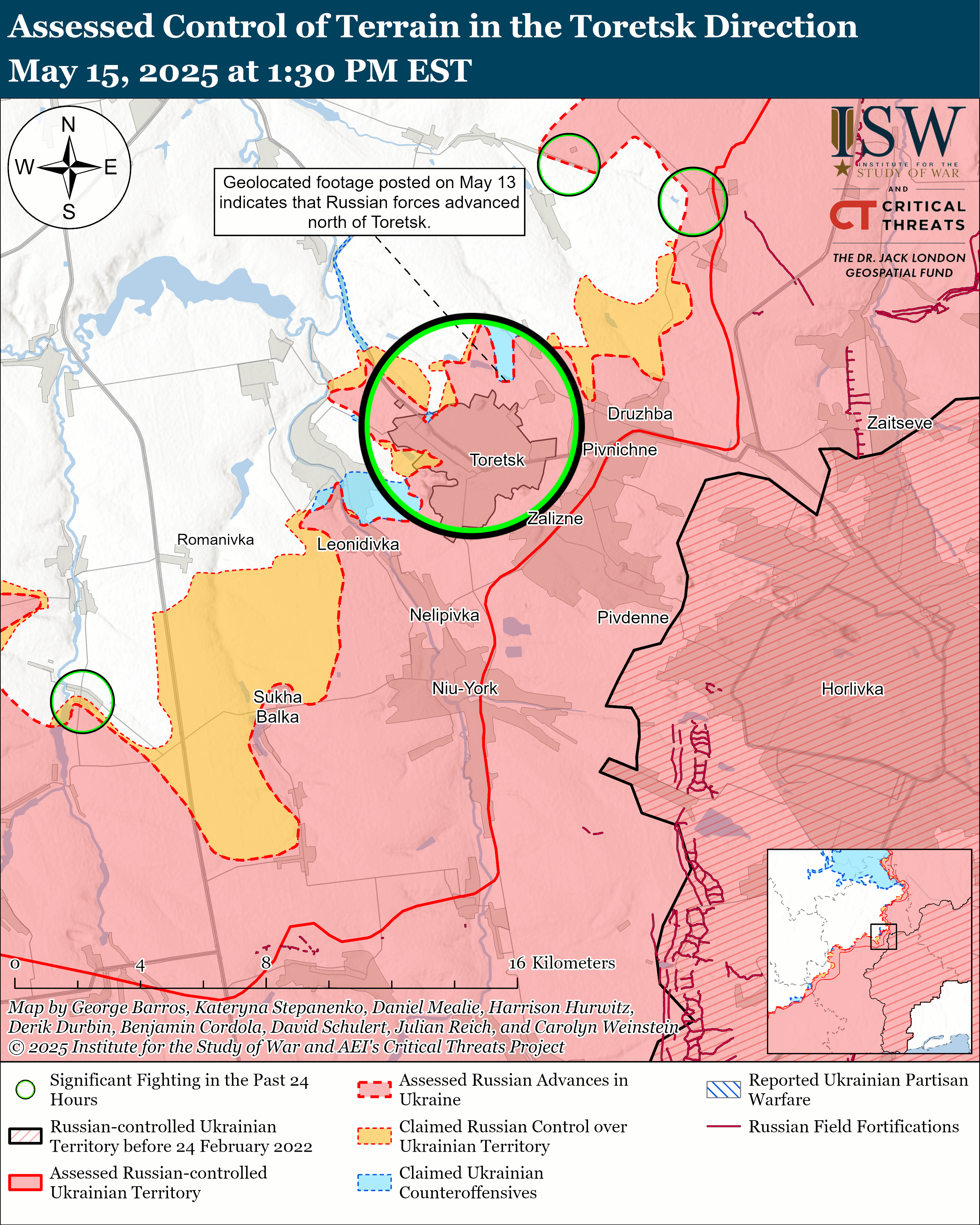Подытоживая, ISW отметил, что украинские войска продвинулись вблизи Торецка, а российские – вблизи Лимана, Новопавловки и Великой Новоселки.