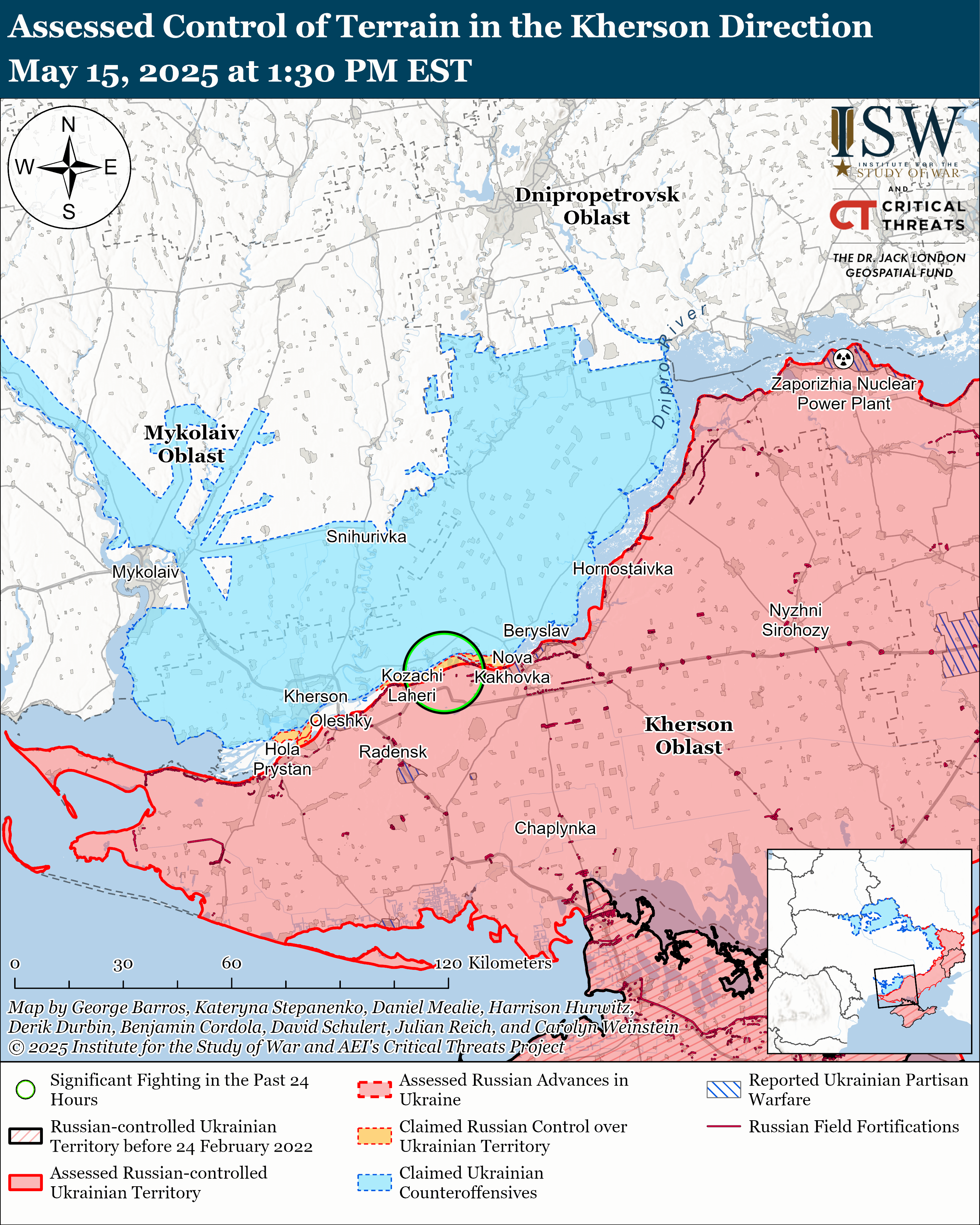 - Бои в Курской области продолжались 14 и 15 мая, ограниченные атаки россияне продолжали и на северо-западе Белгородской области. Подтвержденного прогресса не было.