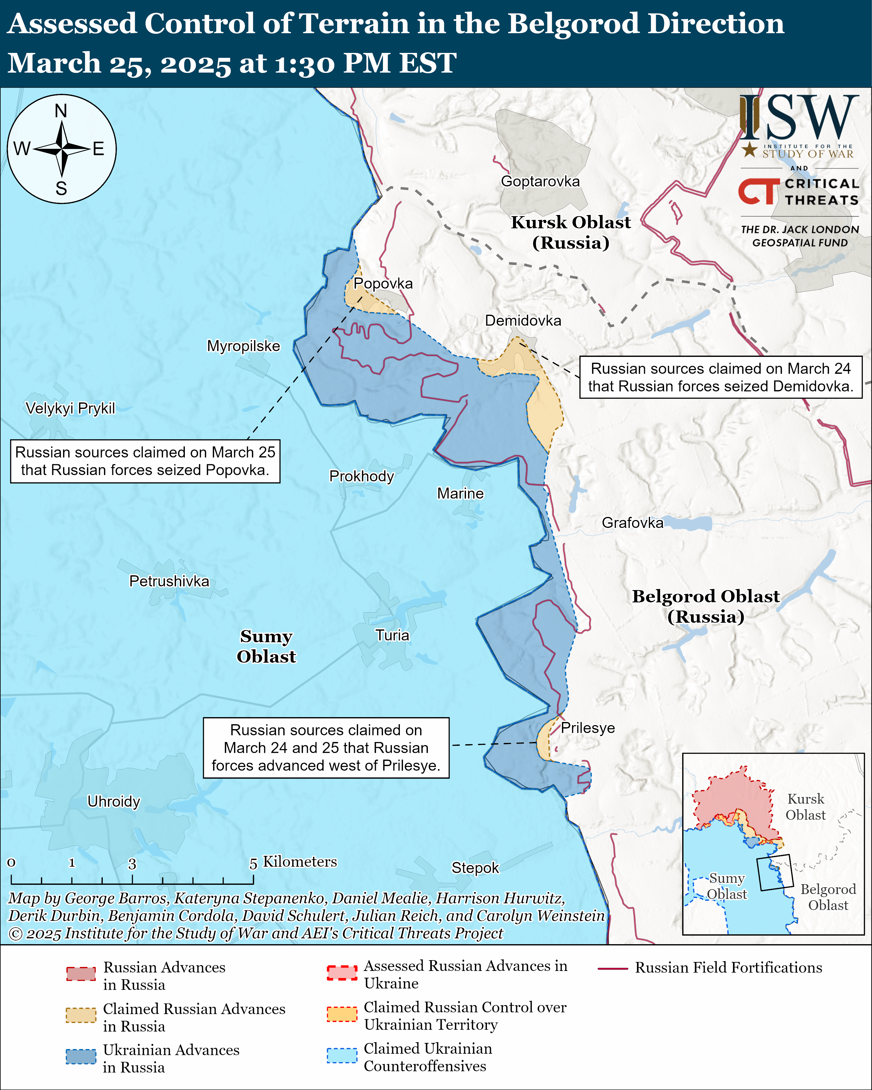 - В то же время Вооруженные Силы, вероятно, продвинулись на запад от Демидовки и на северо-запад от Поповки, что в Белгородской области.