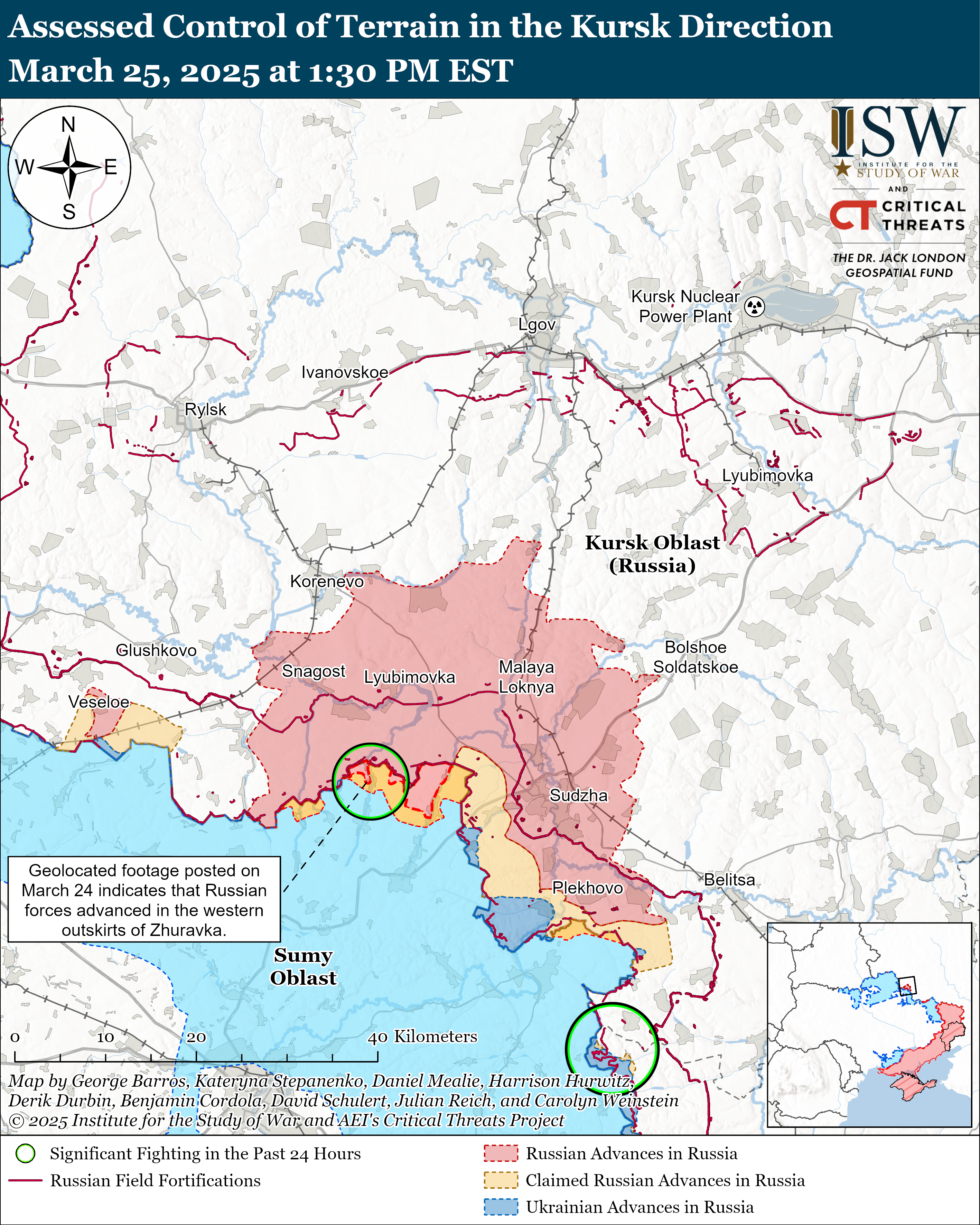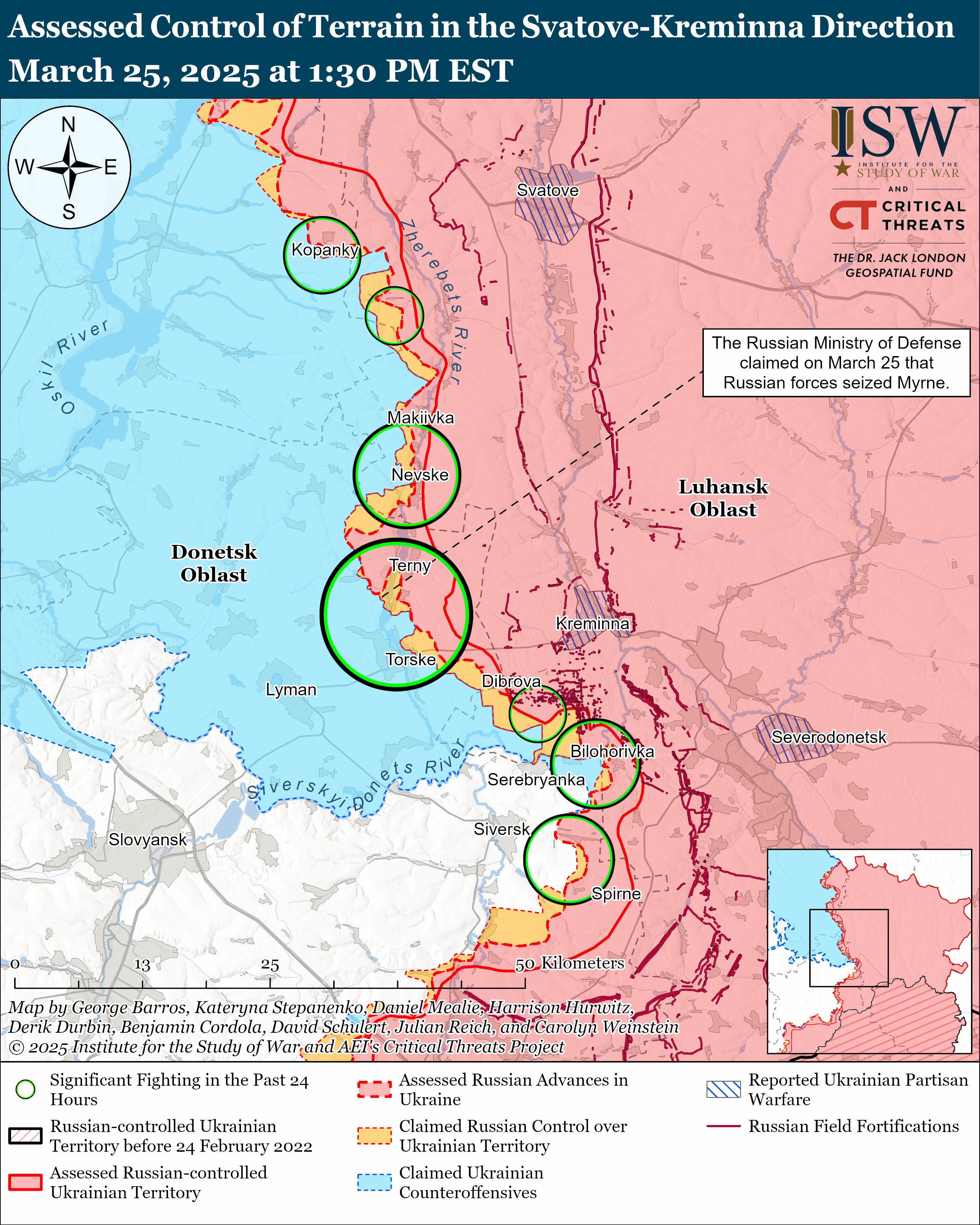 - 25 марта российские войска продолжали наступательные действия на Харьковском направлении, но не продвинулись. Такая же ситуация и на Купянском и Лиманском направлениях, а также возле Боровой.