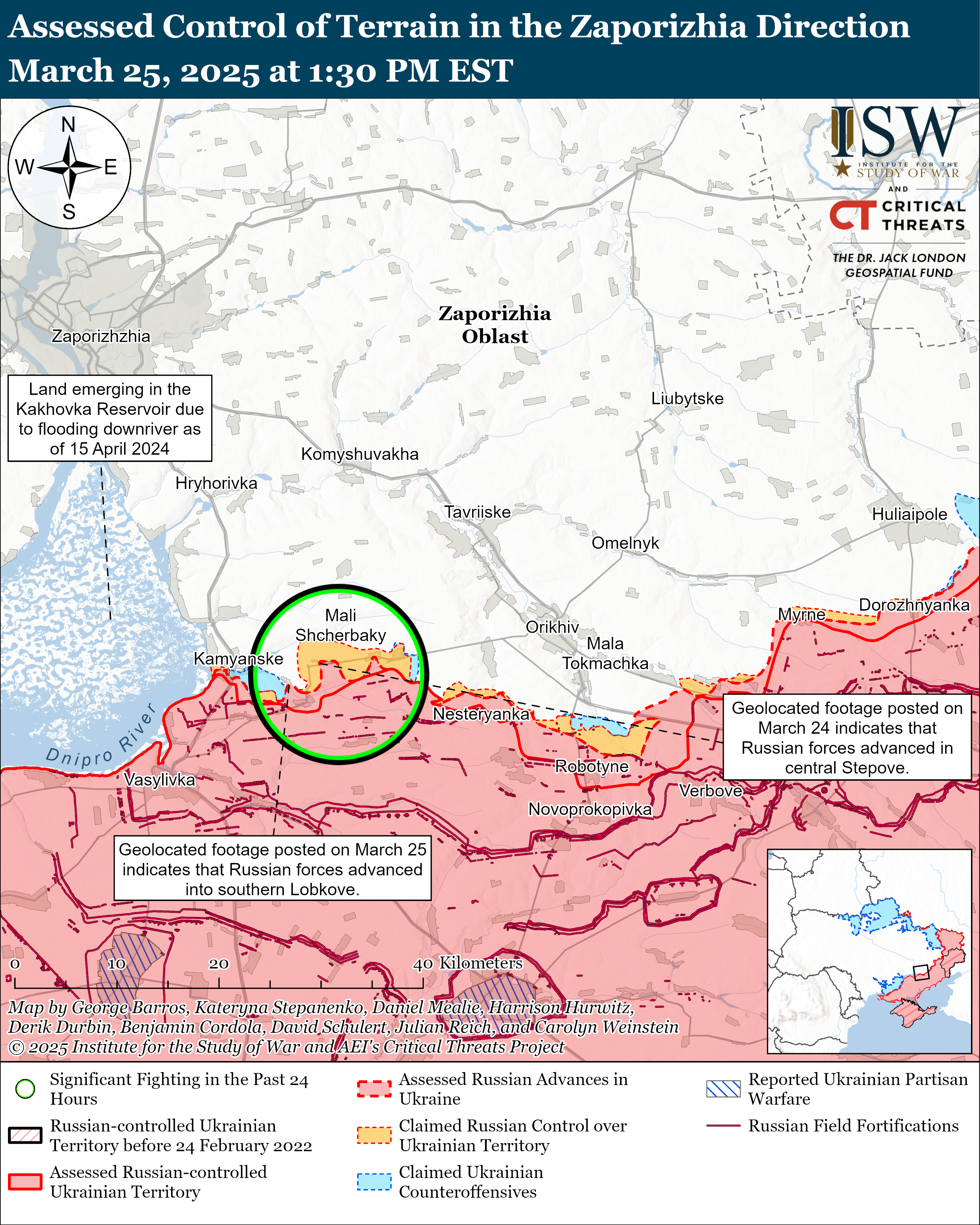 - К сожалению, россияне достигли успеха в Запорожской области. Геолокационные кадры, опубликованные 24 и 25 марта, показывают, что оккупанты продвинулись в центре Степного (северо-западнее Работино) и в южной части Лобкового (северо-западнее Работино).