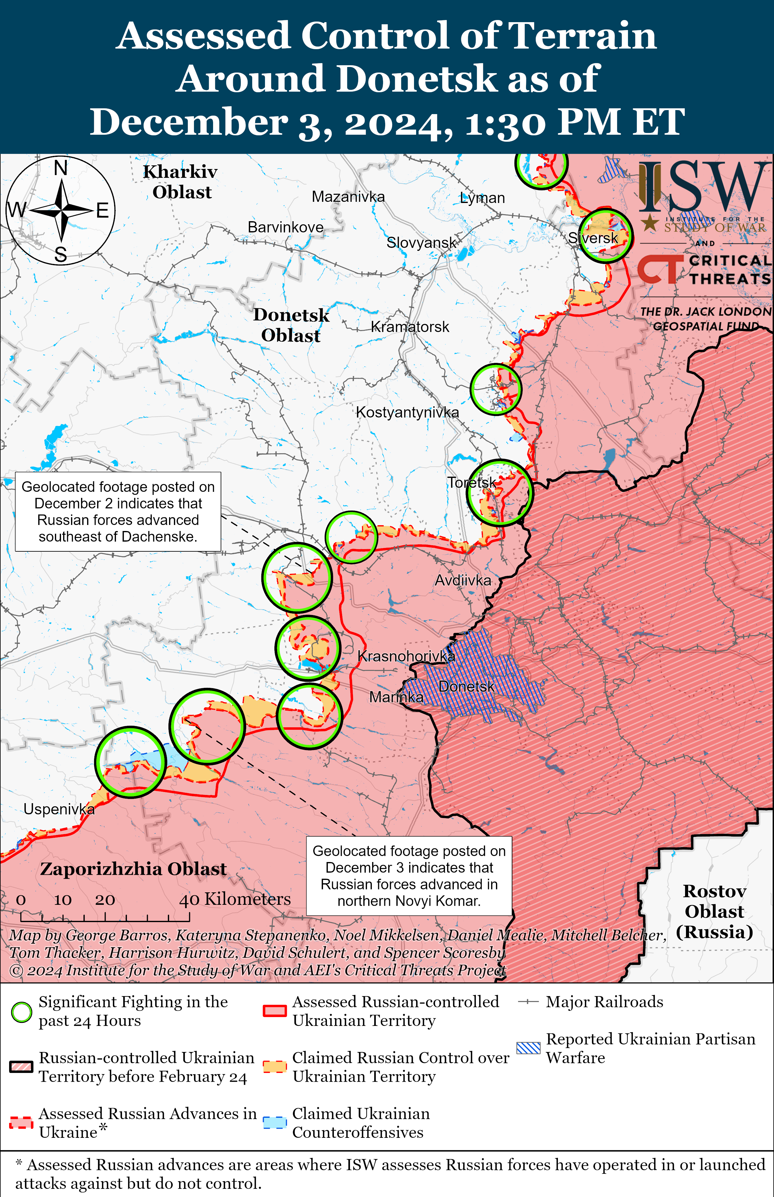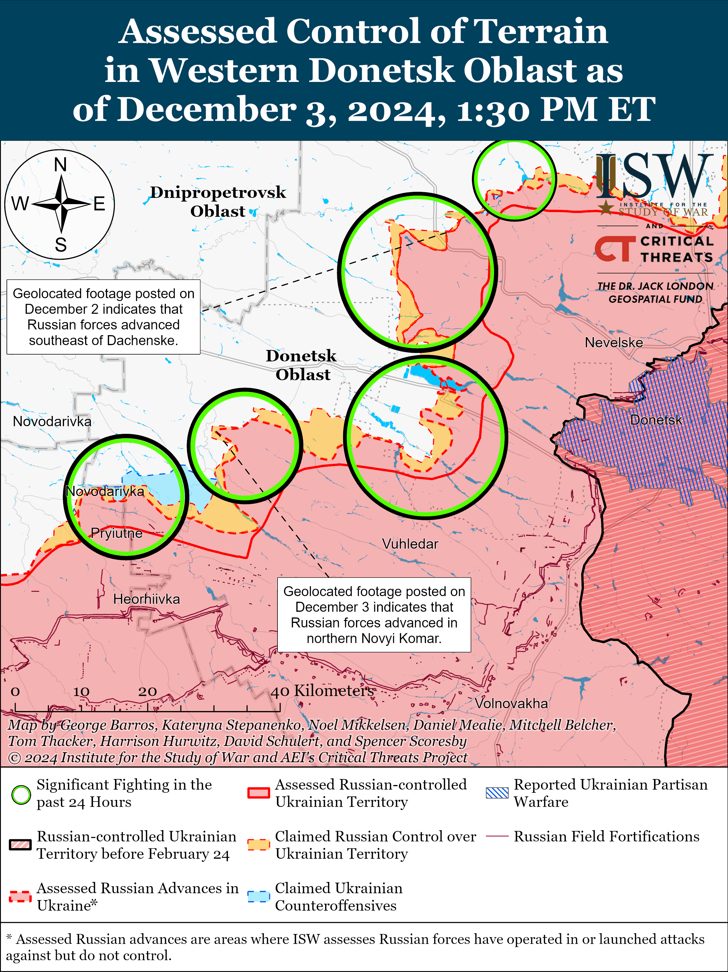Аналитики отметили, что оккупанты проводили наступательные действия вблизи самой Великой Новоселки, к северу от Великой Новоселки у Нового Комара, к северо-востоку – у Раздольного, к западу – у Новоселки и к юго-западу – у Новодаровки и Новополья 2 и 3 декабря. - Оккупанты продолжили наступательные действия вблизи Работино, Новоандреевки и Новоданиловки 2 и 3 декабря. Впрочем, никакого подтверждения успехов врага нет.
