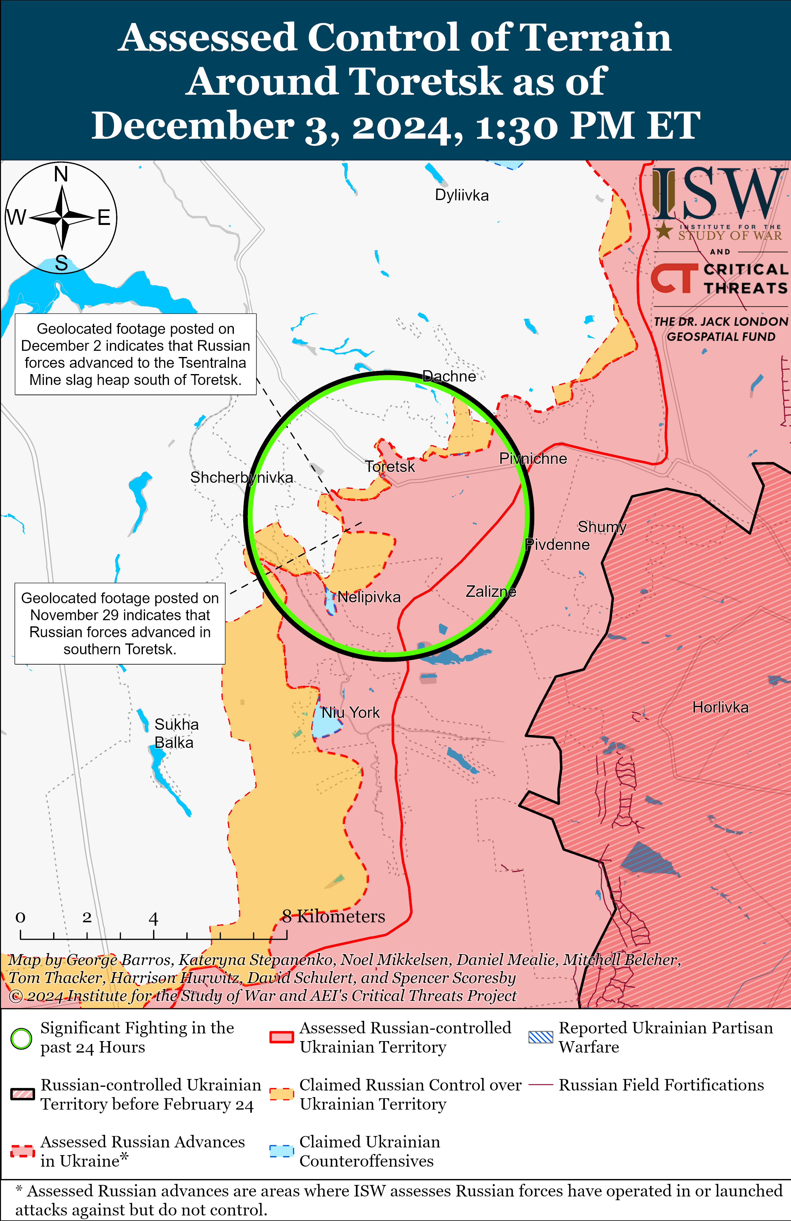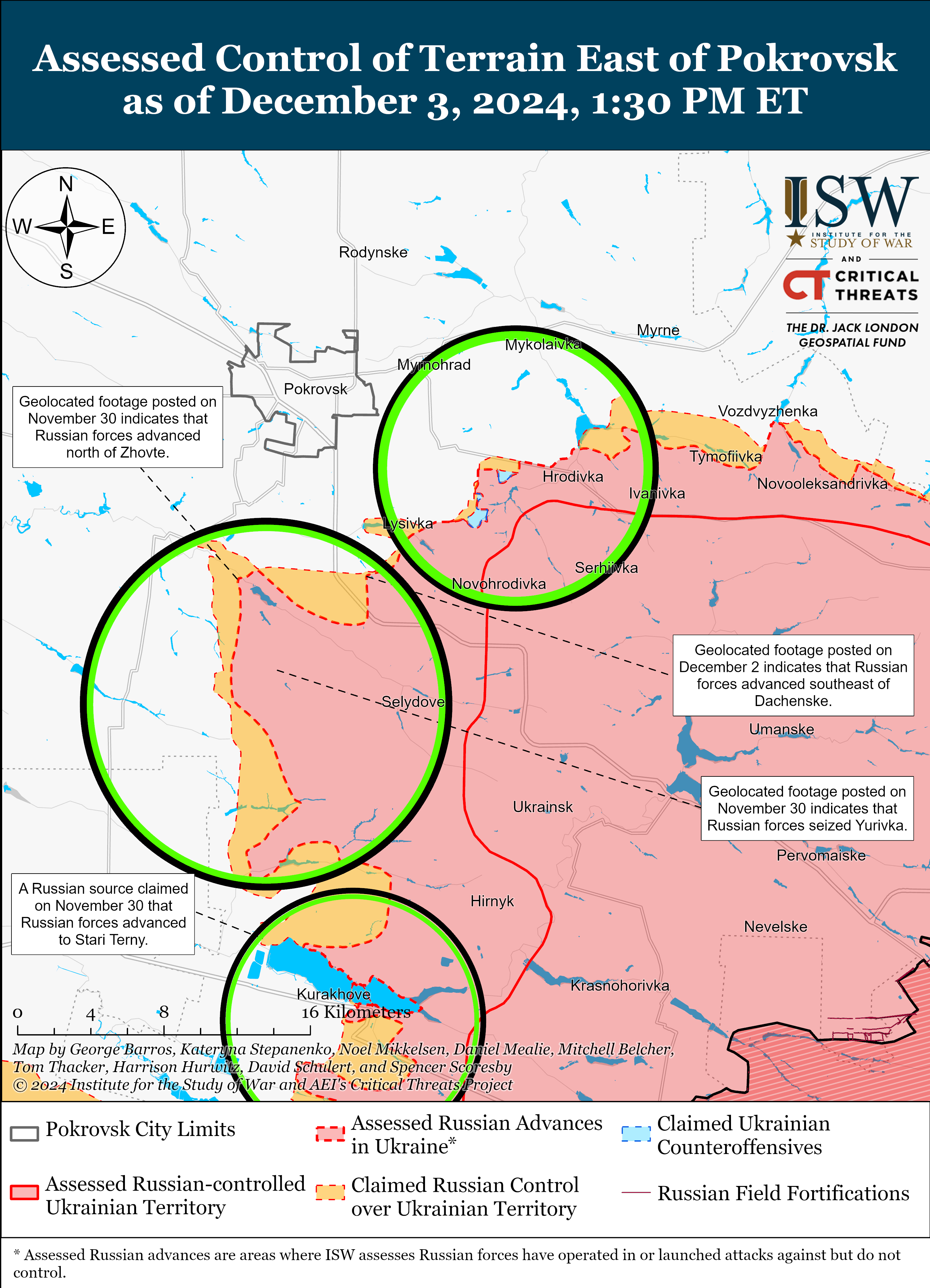 - Агрессор недавно продвинулся на юг от Покровска. Геолокационные кадры, опубликованные 2 декабря, указывают и на продвижение на юго-восток от Даченского, расположенного к югу от Покровска.