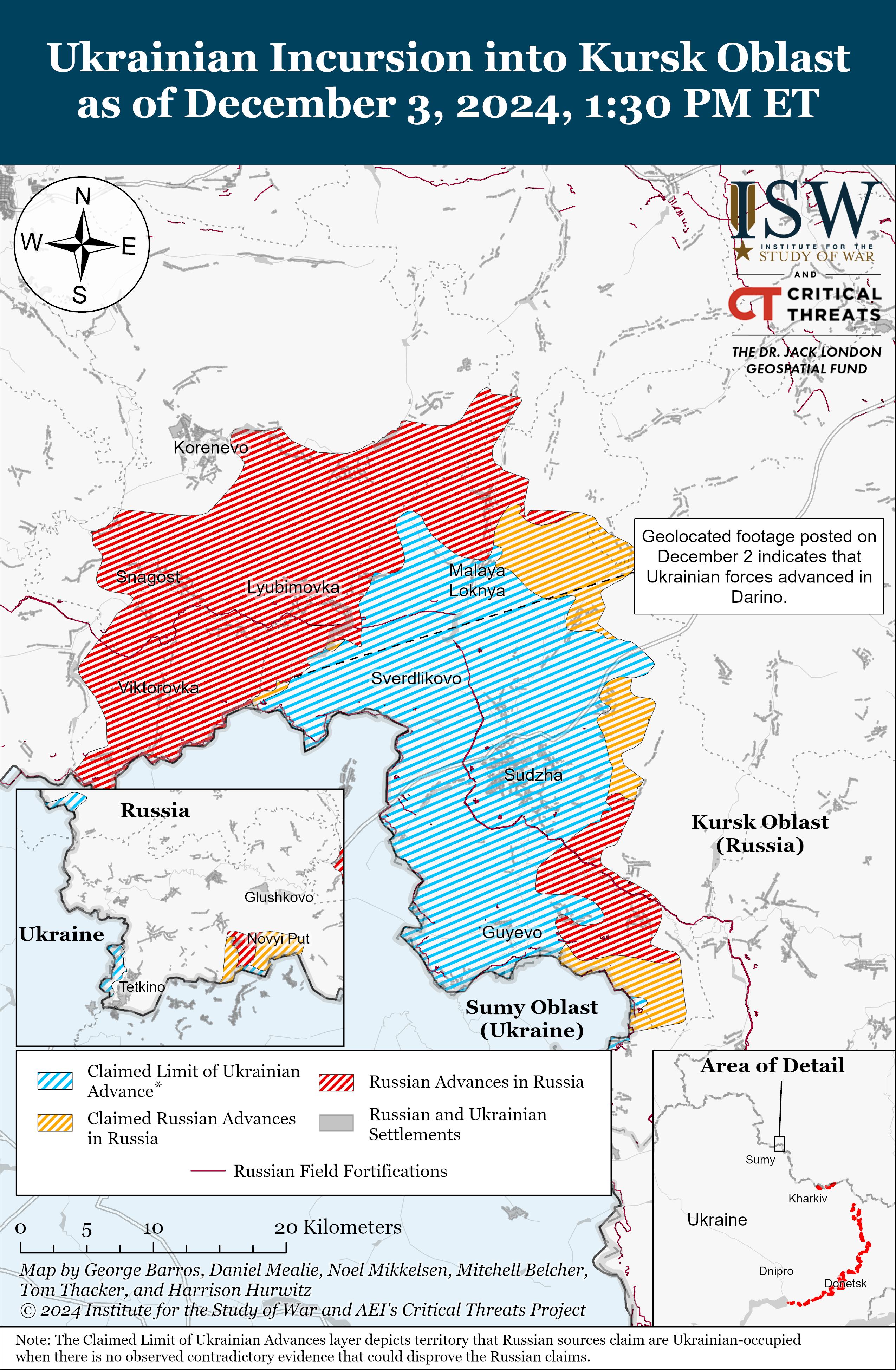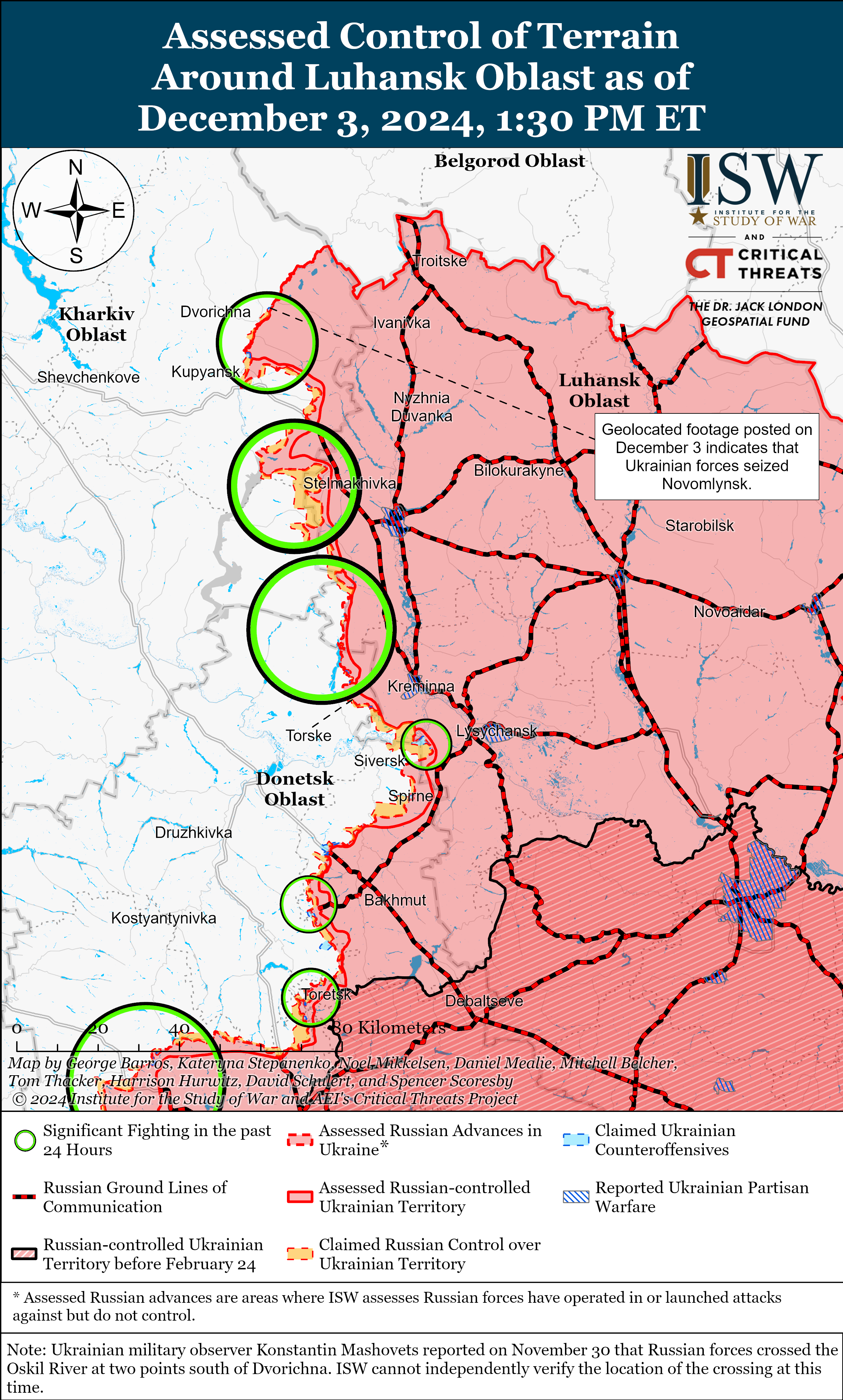 Российские милблогеры утверждали, что враг якобы продвинулся в Новоивановке (к юго-востоку от Коренево) и возле Малой Локни (к северу от Суджи). Однако ISW не наблюдал подтверждения этому. - Оккупанты проводили наступательные операции вдоль международной границы к северу от Харькова в направлении Казачьей Лопани, вблизи Глубокого и к северо-востоку от Харькова вблизи Старицы и Волчанска 2 и 3 декабря. Впрочем, никаких подтвержденных успехов не достигли. Российский милблогер утверждал 2 декабря, что украинские войска провели контратаки на юго-запад от Глубокого.