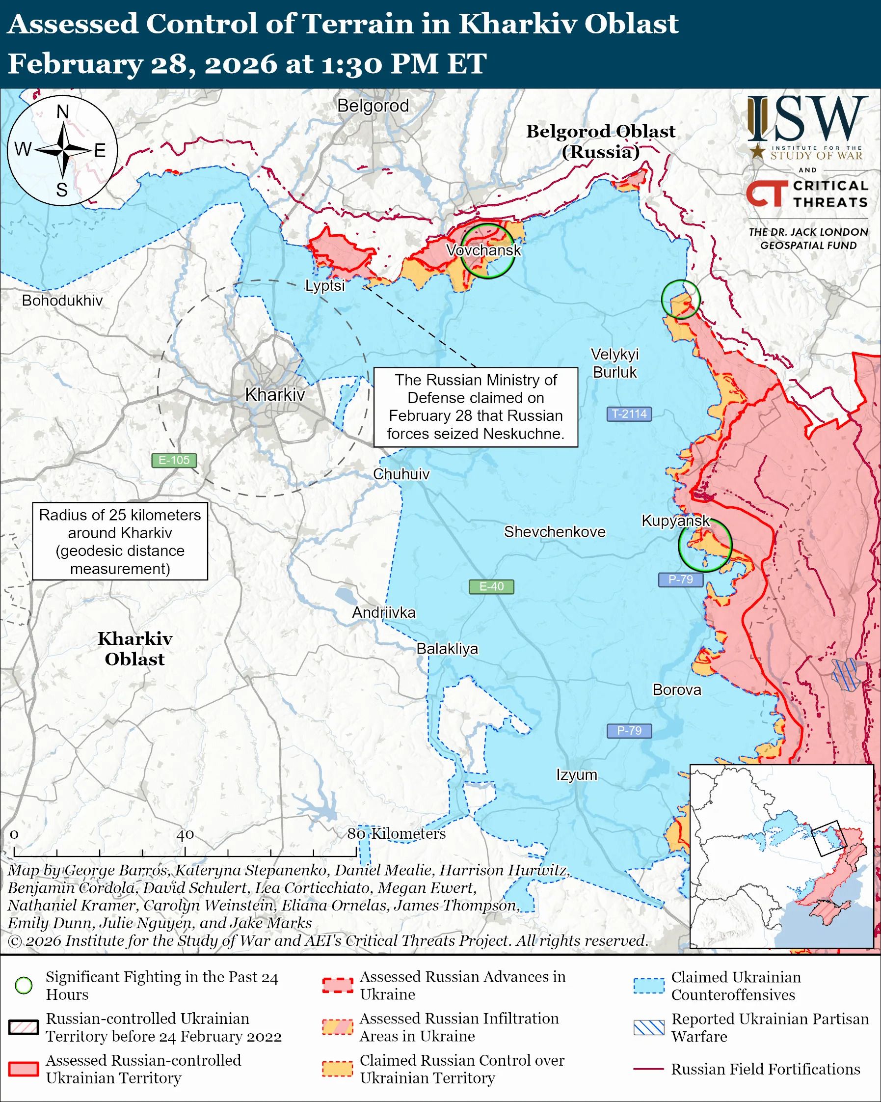 Последние бои на востоке и юге Украины 27 – 28 февраля показывают активизацию обеих сторон на нескольких направлениях фронта. Об этом сообщают аналитики Института изучения войны (ISW) в новом отчете.