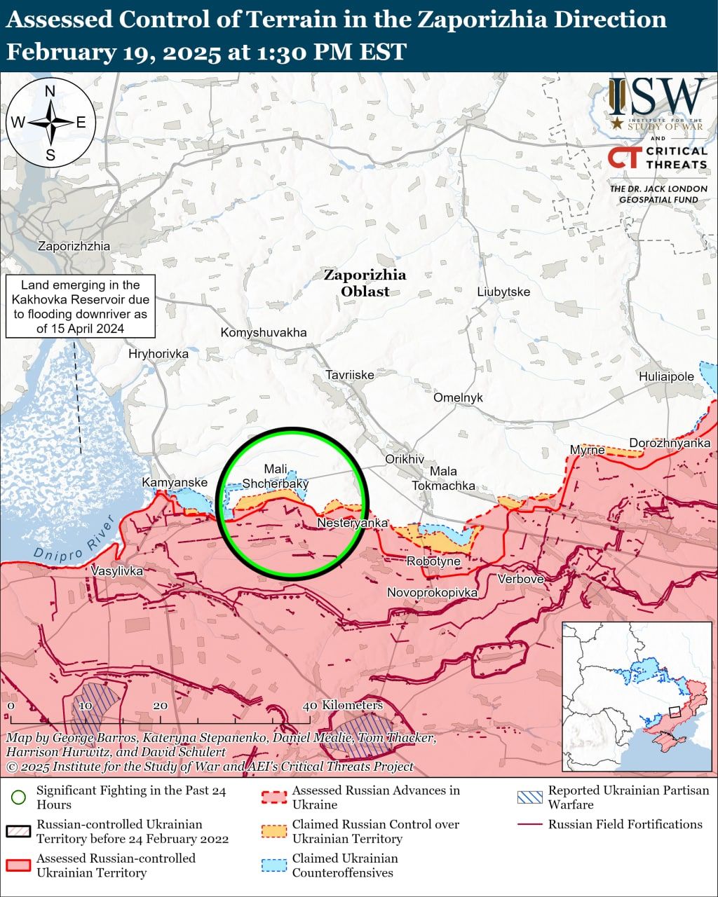 - 19 февраля российские войска продолжили наземные атаки на западе Запорожской области, но не продвинулись. Украинские БпЛА за прошедшие сутки уничтожили российские ЗРК и нанесли удар по позициям россиян вблизи Чумацкого.