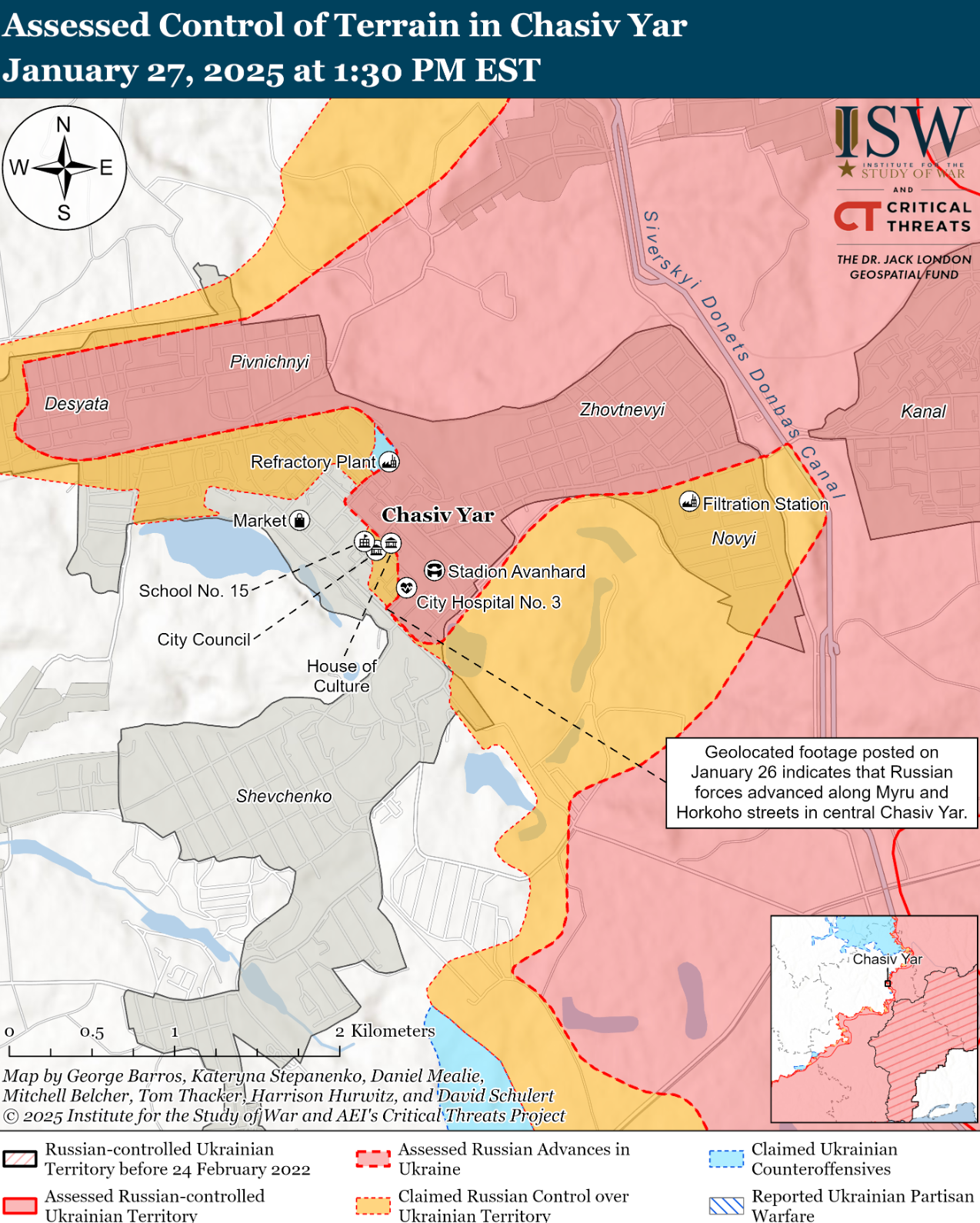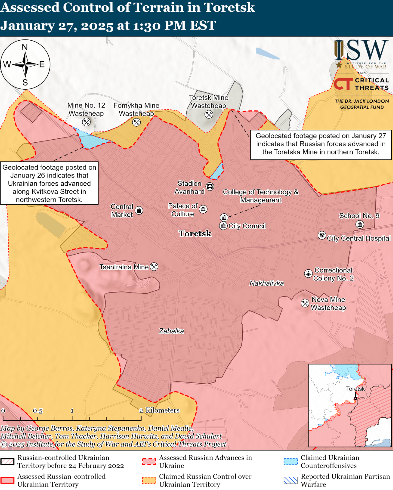 - Украинские и российские силы недавно продвинулись на Торецком направлении. Геолокационные кадры, опубликованные 26 января, свидетельствуют о том, что украинские силы недавно продвинулись на северо-запад Торецка. Дополнительные геолокационные кадры, опубликованные 27 января, указывают на то, что российские войска недавно продвинулись вблизи Торецкой шахты на севере Торецка.