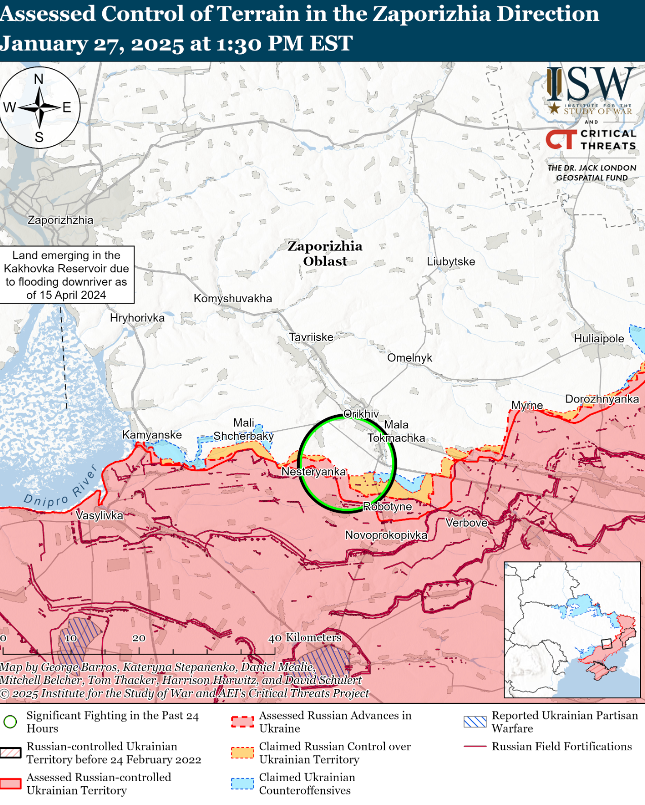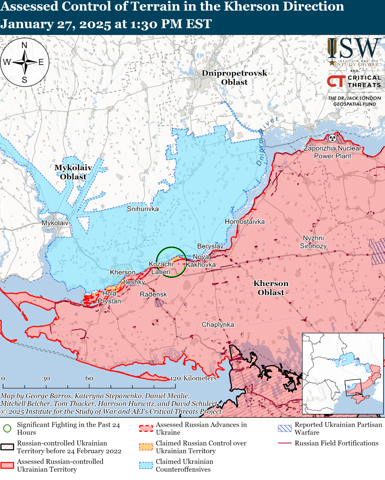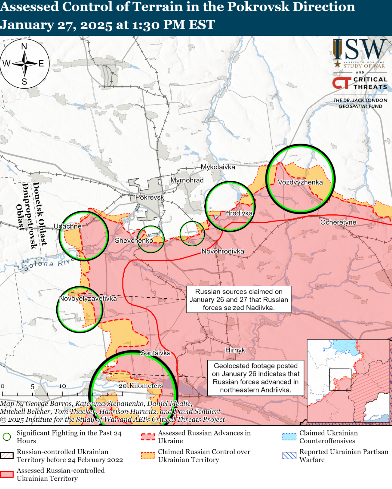 - Российская армия вела наступательные действия к востоку от Купянска в районе Петропавловки, на юго-восток от Купянска вблизи Песчаного и Степной Новоселовки и на юг от Купянска возле Глушковки 26 и 27 января, но не сделали ни одного подтвержденного наступления.