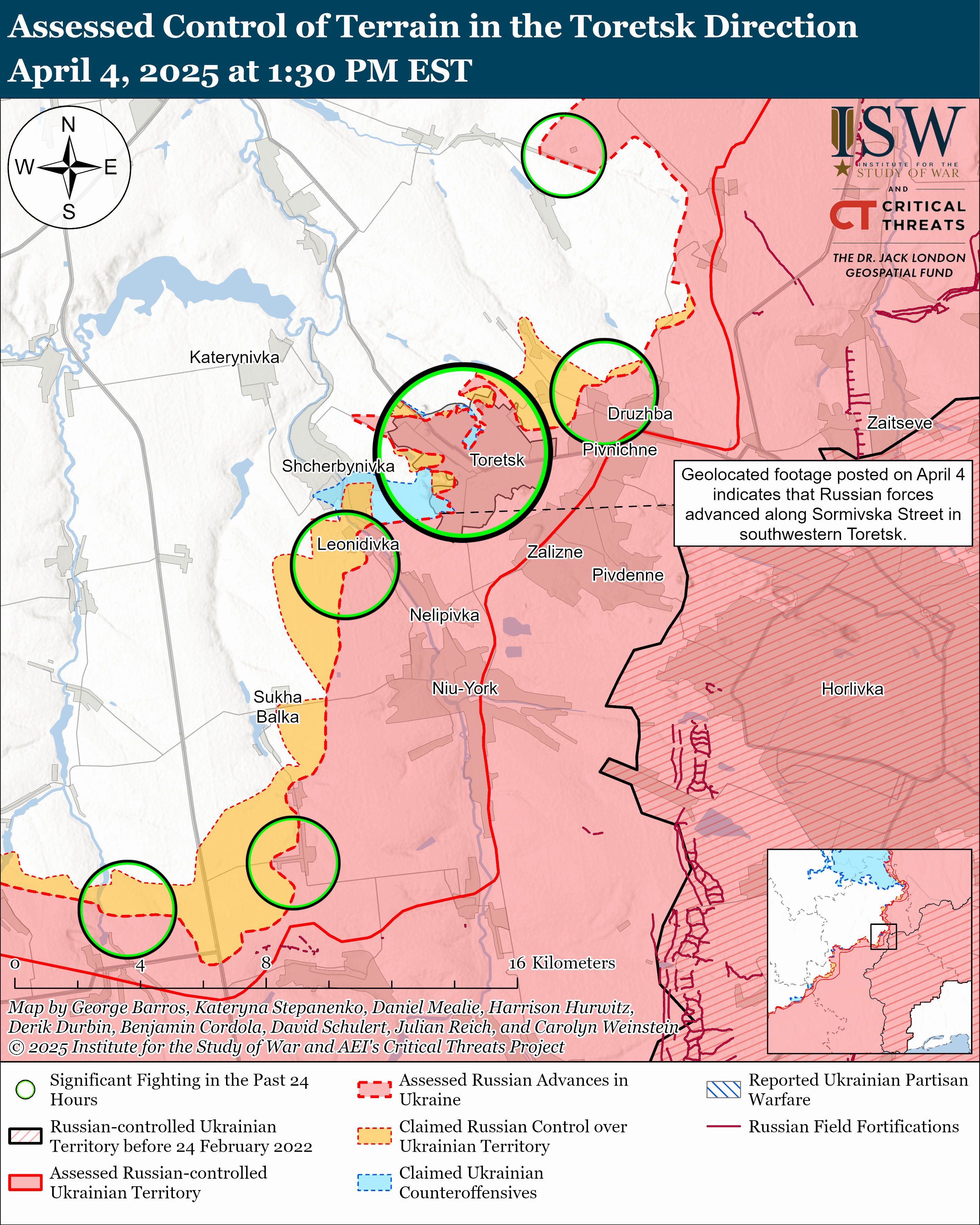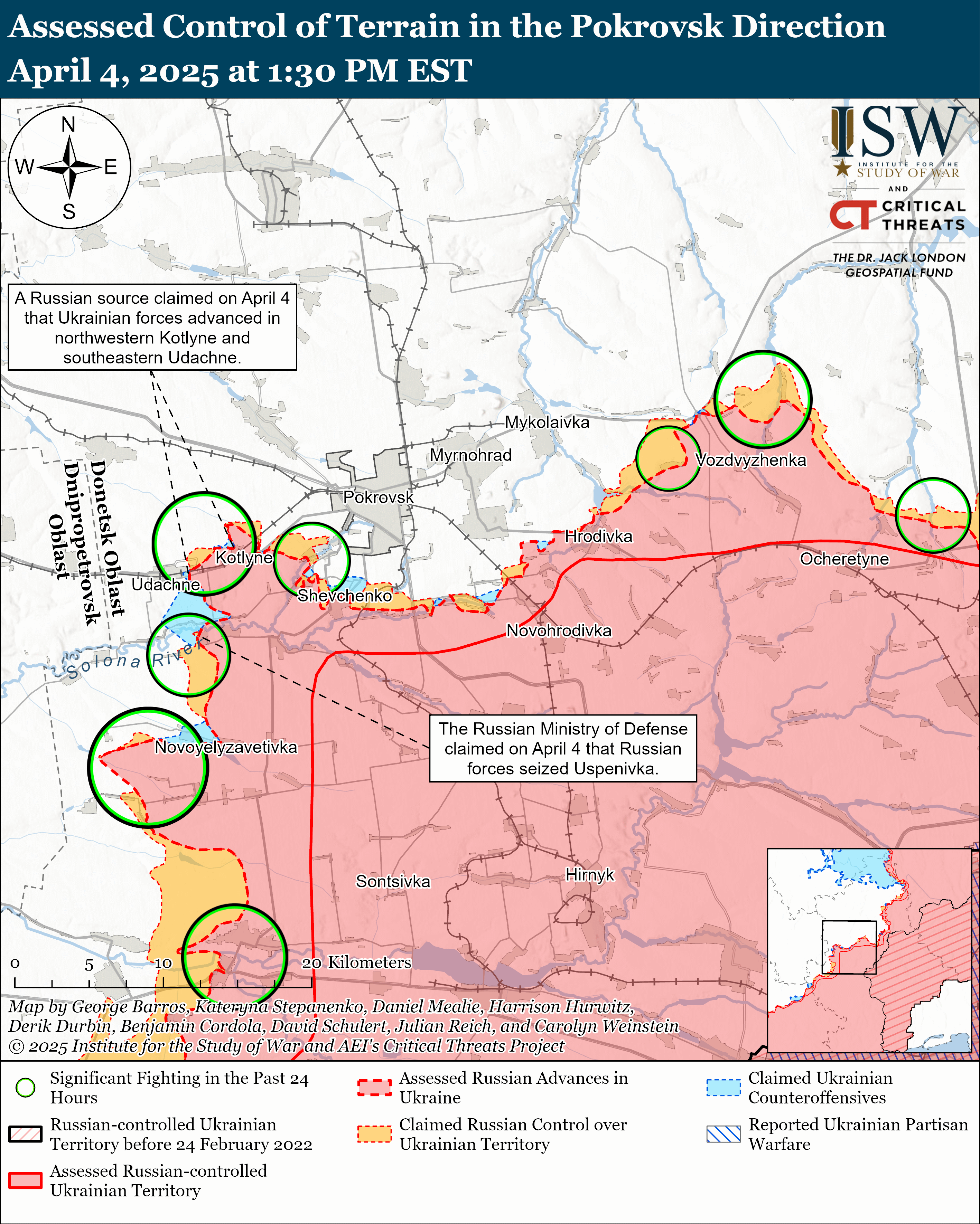 - Российские войска продолжали проводить наступательные операции вдоль границы Сумской и Курской областей 4 апреля, однако продвижение не зафиксировано.