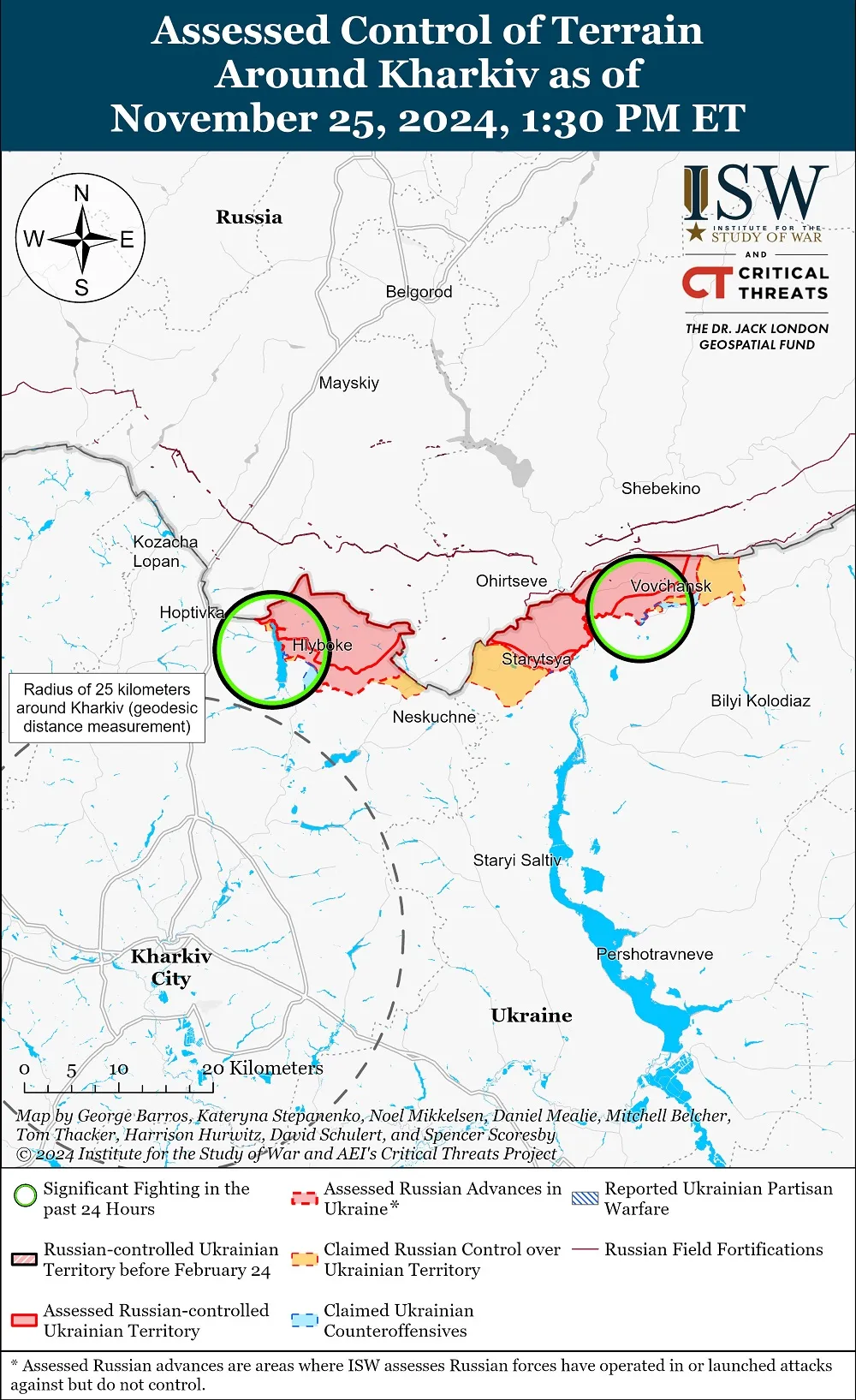 Генштаб ВСУ сообщил, что 24 и 25 ноября российские войска проводили наступательные операции вблизи границы к северо-западу от Харькова в районе Казачьей Лопани и Кудиевки и к северо-востоку от Харькова в районе Волчанска и Тихого.