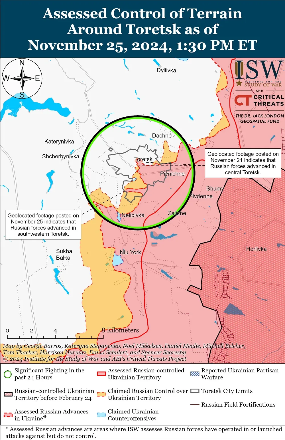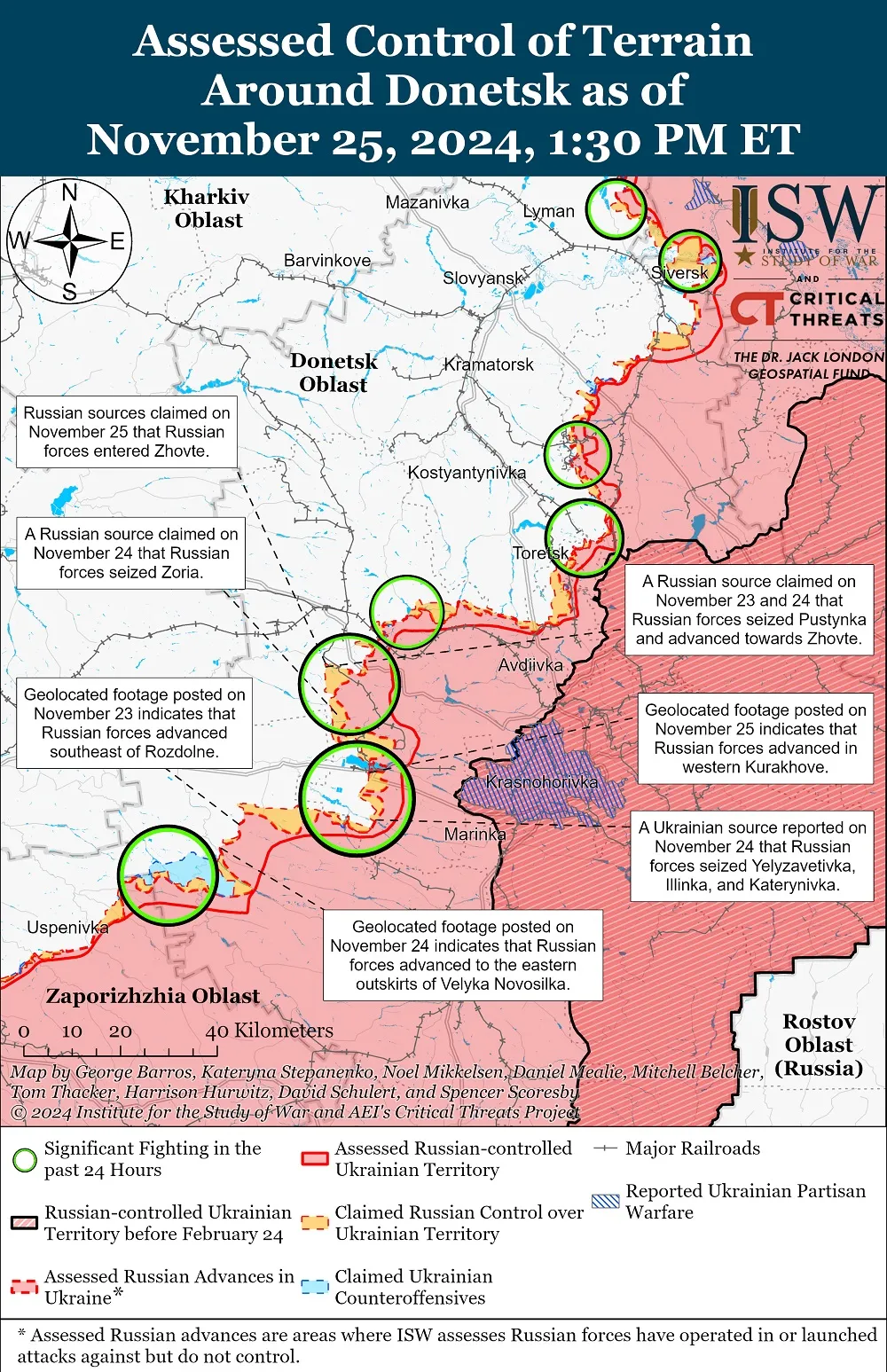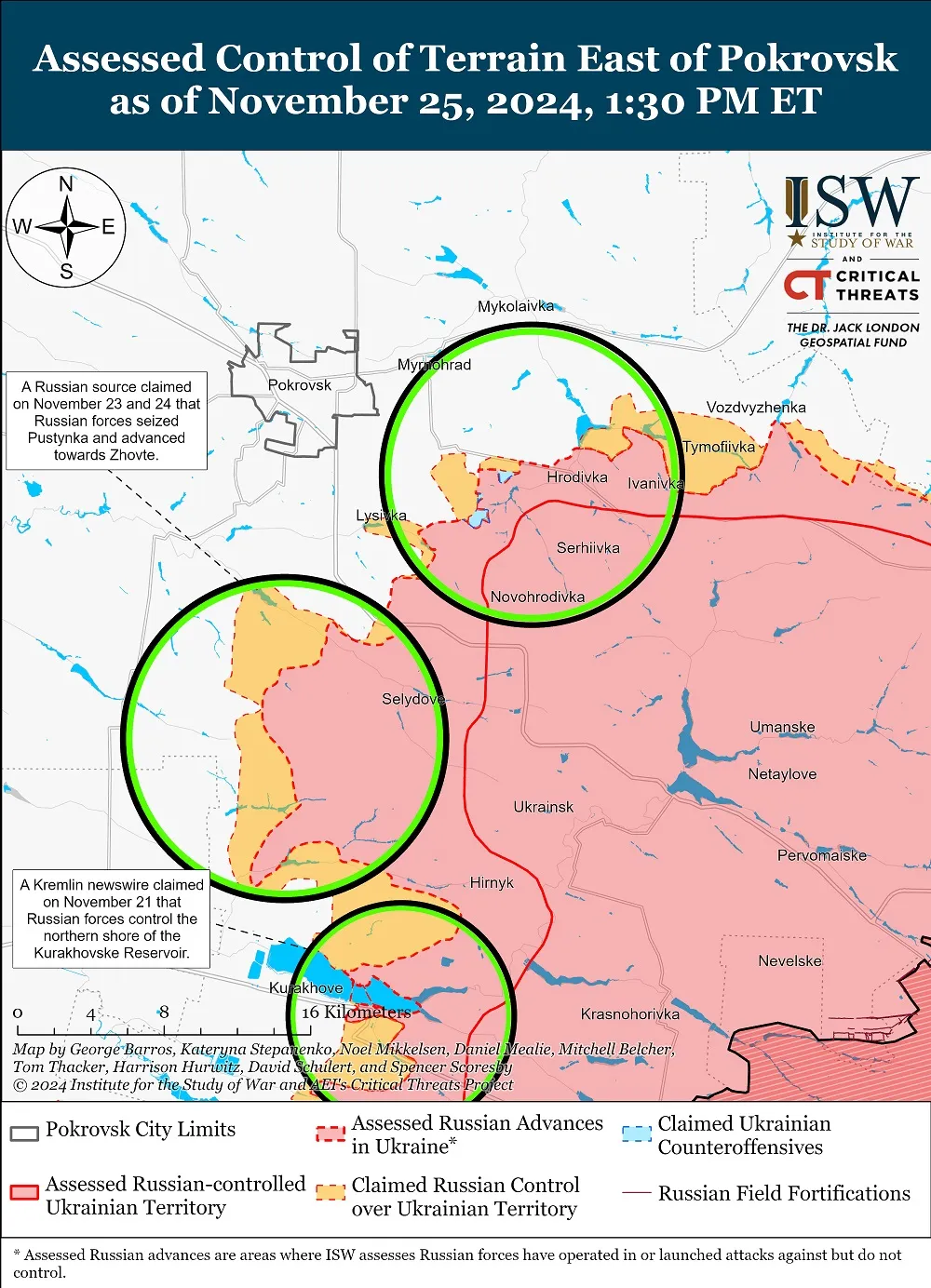 Оккупанты заявляют, что 25 ноября российские войска незначительно продвинулись на юг и юго-восток от Покровска. Однако ISW не может самостоятельно проверить эти заявления.
