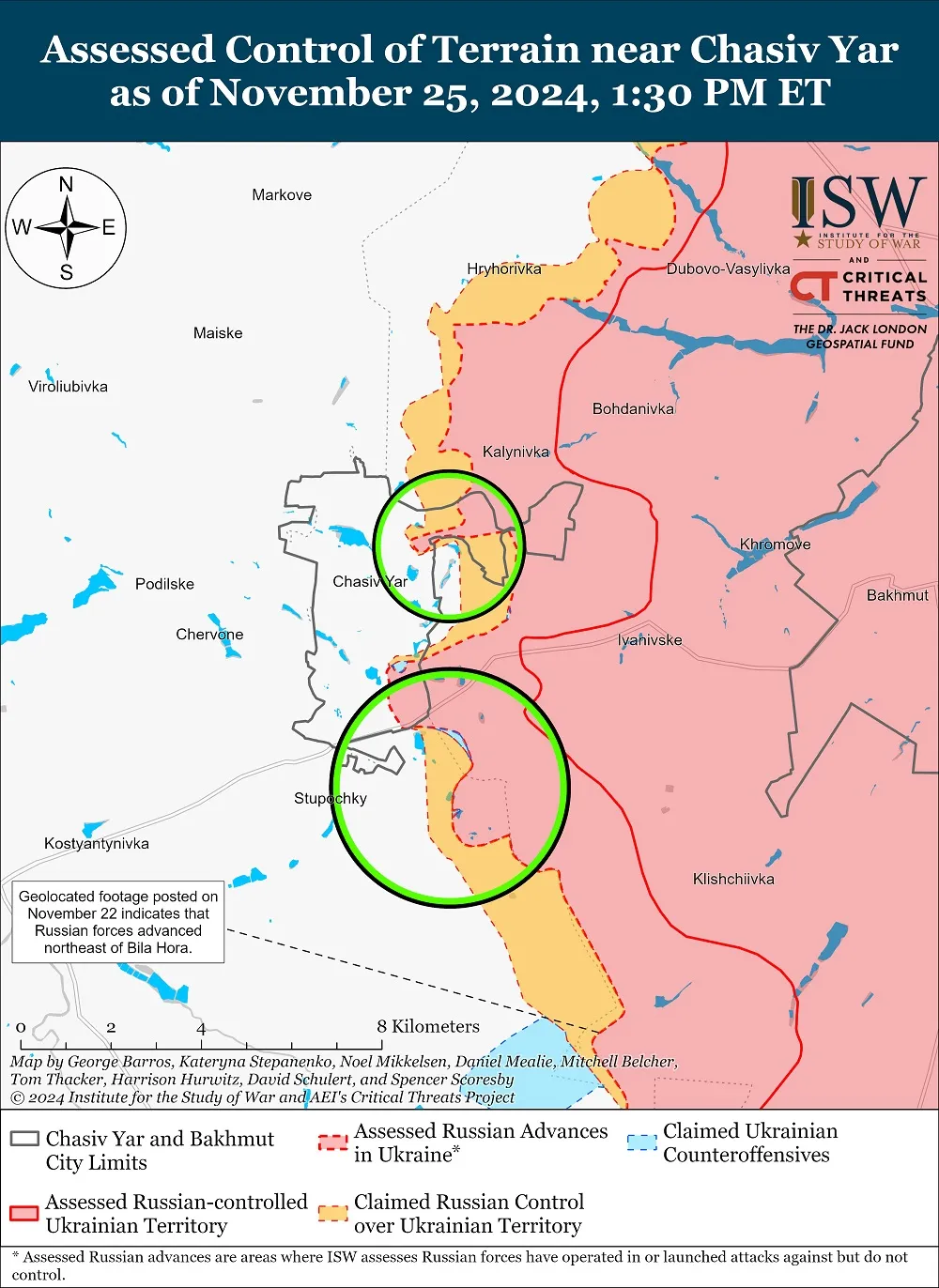 Оккупанты утверждают, что продвинулись вперед возле стадиона в Часовом Яру, время от времени проникают в промышленную зону и захватили карьер возле Ступочек. В ISW не видели визуальных доказательств, которые бы подтверждали эти максималистские заявления.