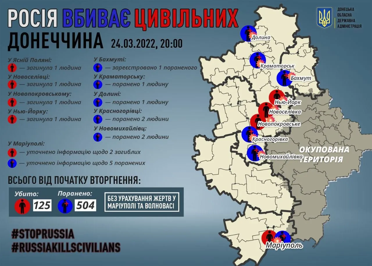 Всего за 24 марта от российских обстрелов погибли три человека: в Нью-Йорке, Новоселовке и Новопокровском. Ранено – 6 человек. Между тем в Бахмуте медицинскую помощь получил 1 человек, раненый в Луганской области.