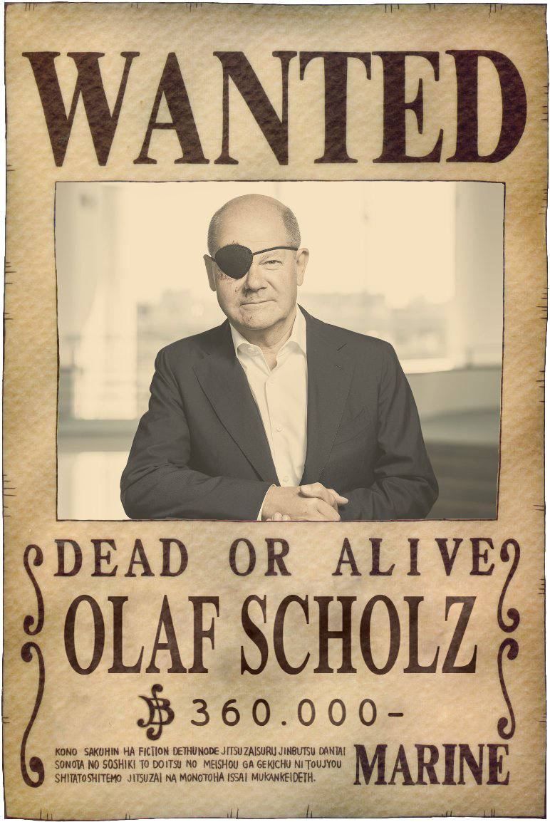 Самой популярной тематикой мем стала, конечно, пиратская. Поэтому прежде выдумщики поспешили надеть на Шольца пиратскую шляпу. Первый известный персонаж, приходящий в голову во время созерцания "Шольца в новом амплуа" – это известный персонаж Стивенсона Джон Сильвер. Хотя тому не хватало не глаза, а левой ноги, пользователи соцсетей решили уподобить канцлера герою "Острова сокровищ" и посадили ему на плечо попугайчика.