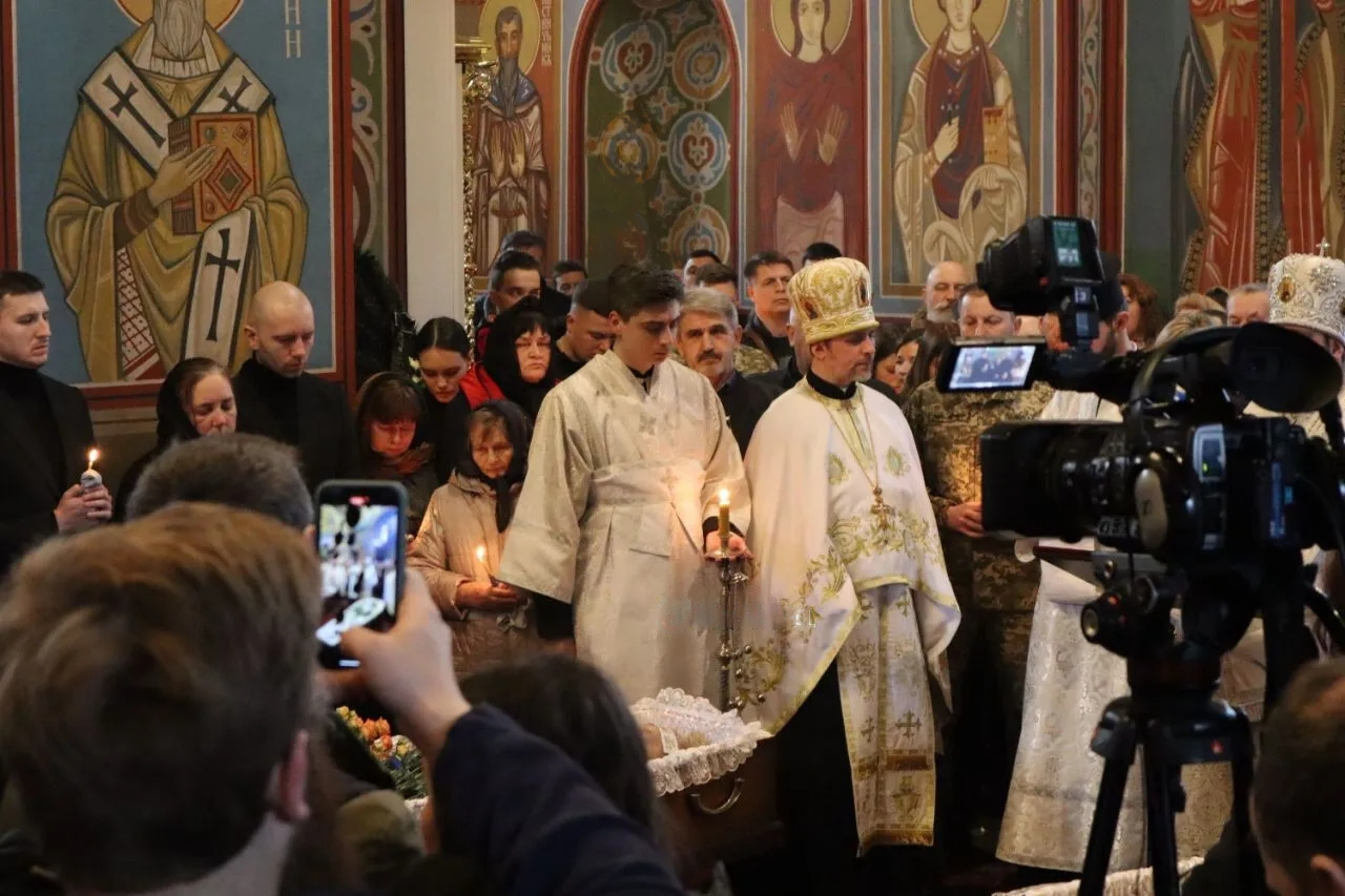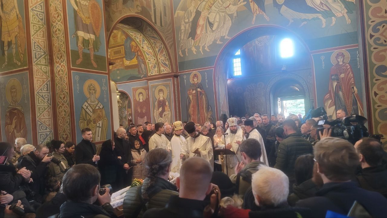 В храм пришли родственники, близкие и знакомые павшего защитника. Известно, что церемония прощания продолжится на Майдане Незалежности.