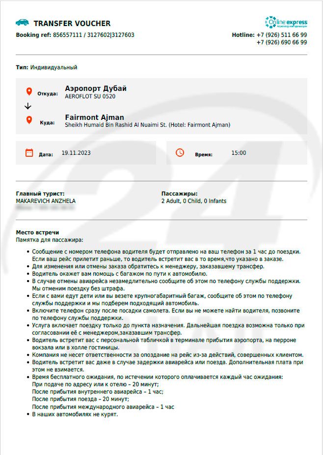 Также россиянки приобрели ваучер на трансфер из аэропорта Дубая прямо в гостиницу и позаботились о страховом полисе для путешествия. Эти документы также оказались в нашем распоряжении.