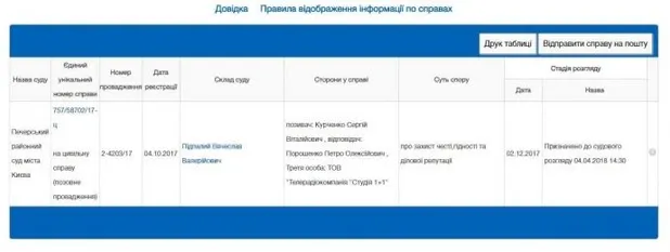 Там отмечается, что Сергей Курченко подал иск о защите чести, достоинства и деловой репутации против Петра Порошенко и "Телерадиокомпании "Студия 1+1" еще 4 октября.