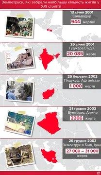 Отметим, что в XXI веке состоялось 14 землетрясений, которые унесли жизни 1 тысячи человек и более. Несколько "не дотянуло" до этой ужасной отметки землетрясение у побережья Сальвадора, унесшего жизни 944 человек в январе 2001 года. В этом же месяце землетрясение в Гуджарате (Индия) унесло жизни более 20 тысяч человек. В следующем году в Афганистане (горный массив Гиндукуш) землетрясение унесло жизни 1 тысячи человек.