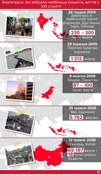 В следующем году стихия не прекратила уносить жизни жителей этого региона – в марте в результате землетрясения в Индонезии погибли 1 313 человек, а в октябре 2005 года в Кашмире (Пакистан) жертвами стихии стали от 87 до 100 тысяч человек. А землетрясение 12 мая 2008 года в китайские провинции Сычуань унесло жизни 69 197 человек, еще более 19 тысяч пропали без вести.