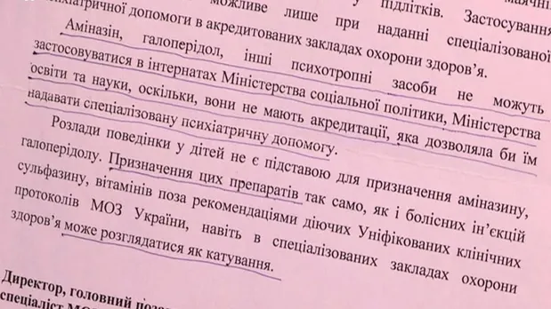 Параллельно журналисты изучали письмо от главного внештатного специалиста Минздрава Украины по специальности "психиатрия, наркология", в котором указано, что такие психотропные средства, как аминазин и галоперидол, не могут применяться в интернатах, а их назначение может рассматриваться как пытки.