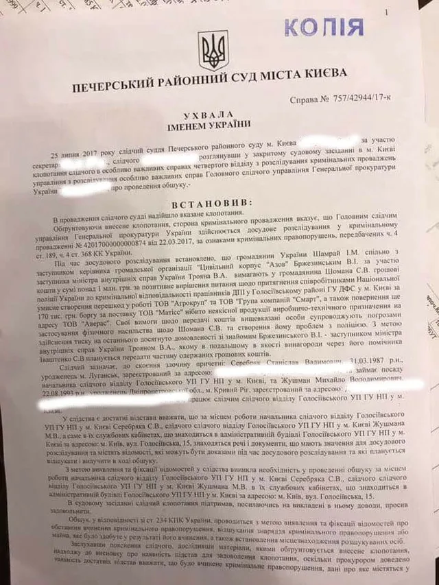 Из документа следует, что к делу также причастны заместитель председателя Гражданского корпуса "Азов" и сотрудники Голосеевского управления полиции.