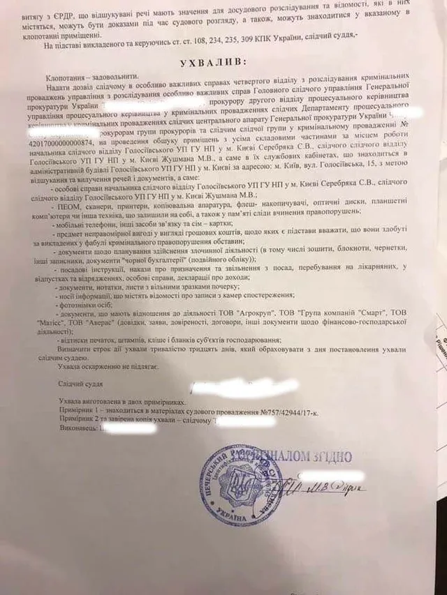 Суд разрешил провести обыски у Серебряка и Жушмана, а об обысках у Трояна ничего не указано.
