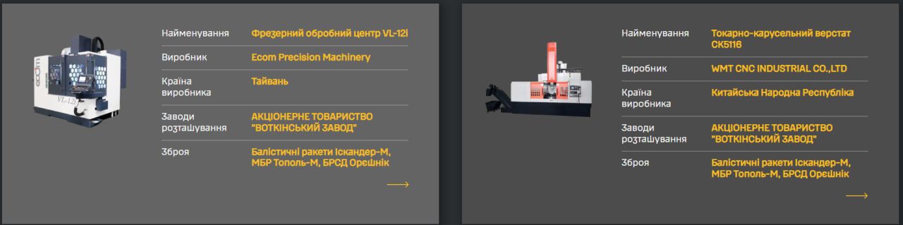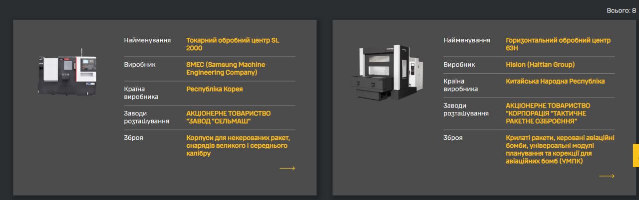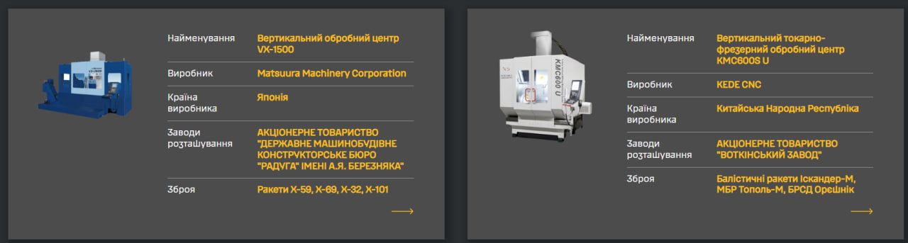 Портал War&Sanctions от ГУР обнародовал данные об иностранном оборудовании, которое российские предприятия применяют при изготовлении модулей УМПК, ракет и артиллерийских боеприпасов.