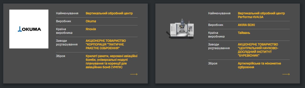 - японских обрабатывающих центров Okuma и китайских Hision на производстве универсальных модулей планирования и коррекции (УМПК) для авиабомб российской корпорации "Тактическое ракетное вооружение",