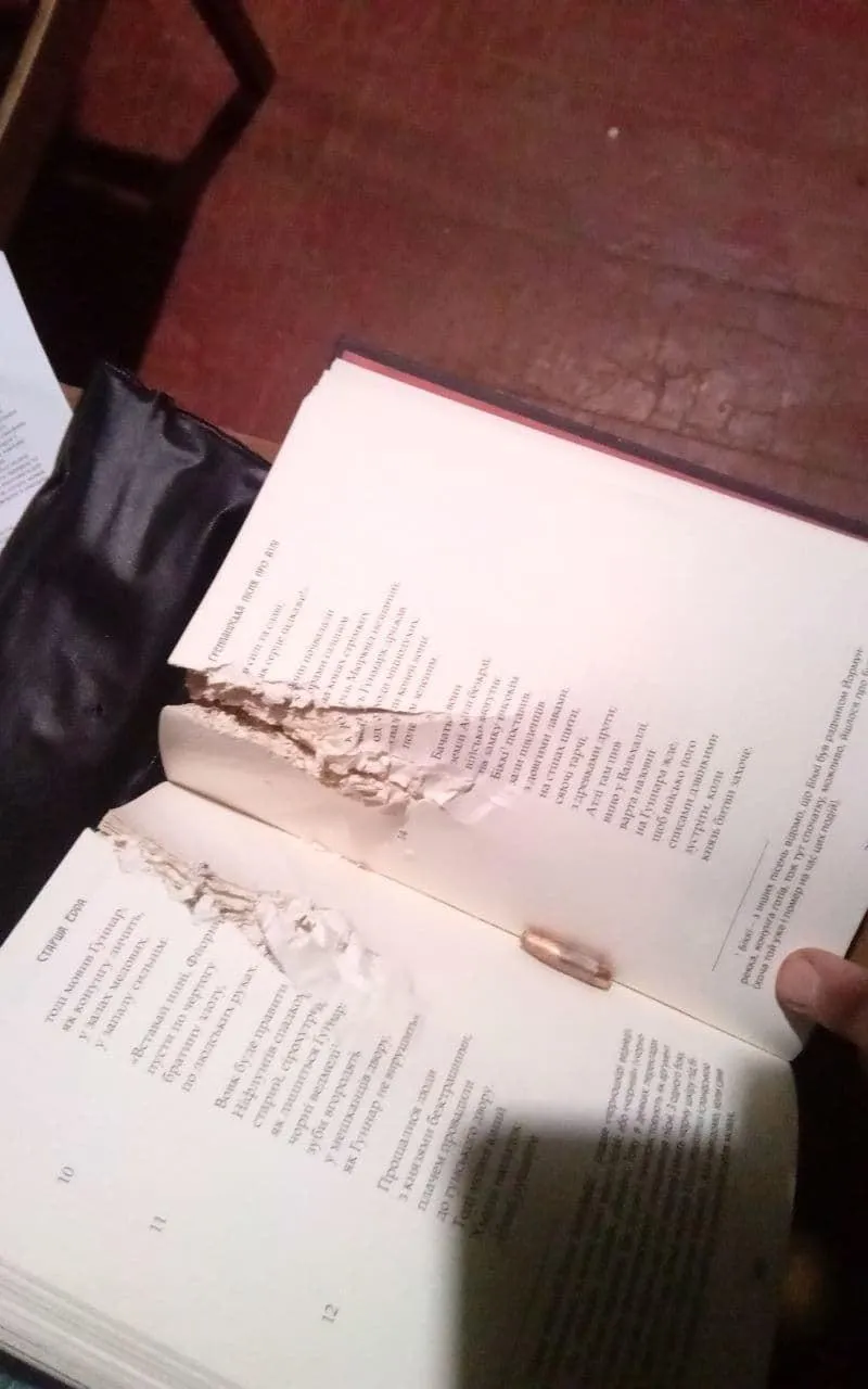 Он опубликовал фото поврежденного сборника и рассказал детали. Книга якобы остановила снайперскую пулю, когда враг обстреливал украинские позиции на фронте. В то же время имя бойца, который избежал ранения Кривонис не назвал.