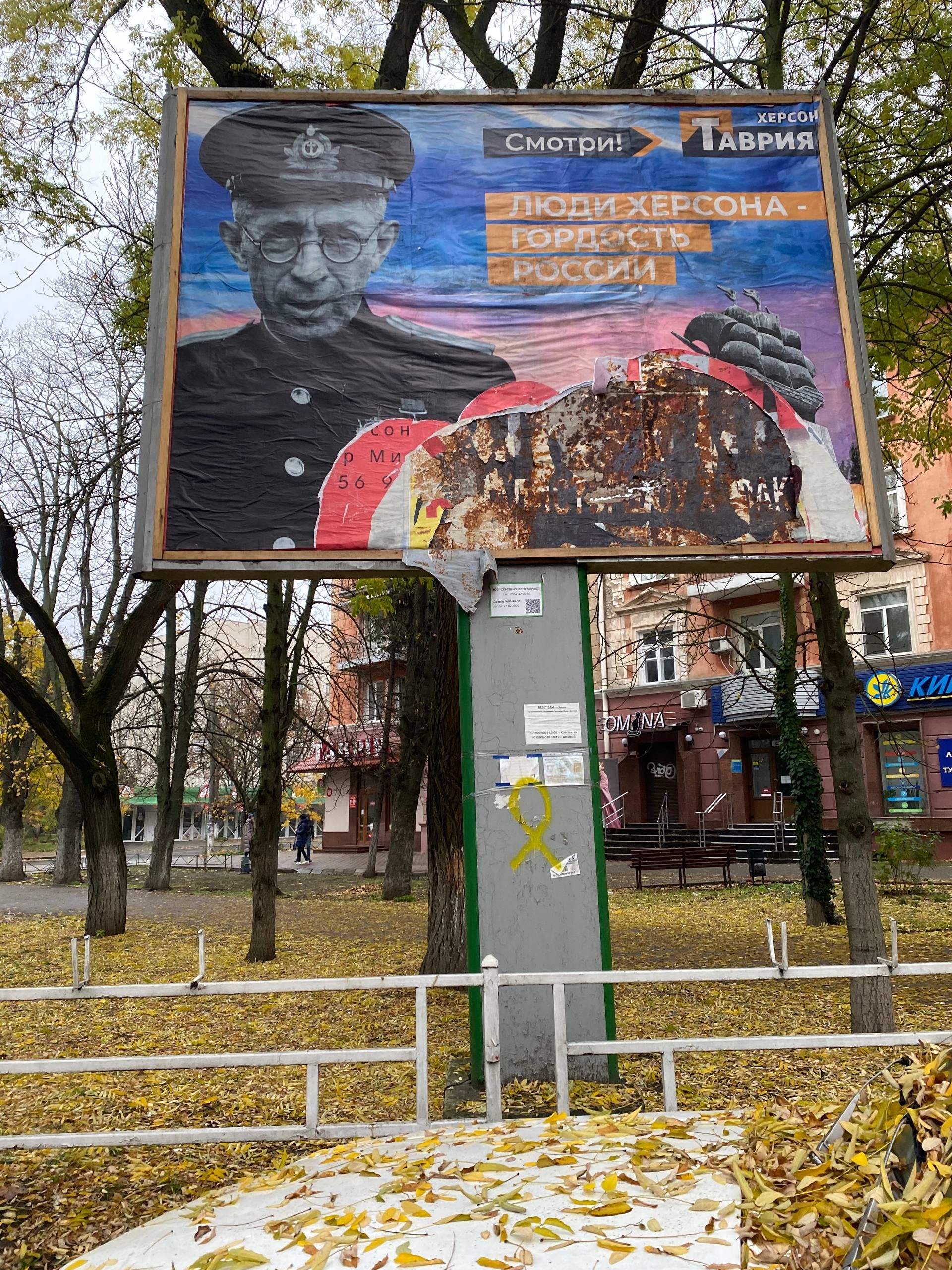 Недалеко от площади тем временем едет грузовик, который через несколько часов станет легендой. За его рулем Ияль Исраэли. 17 лет он живет тут после переезда из Израиля, но сегодняшний день не забудет никогда. ВСУ близко, российская нечисть убегает, а это значит, что город нужно почистить. Буквально. Ияль с друзьями разъезжает по городу на грузовике АТБ, который останавливается у каждого билборда – с них снимают те плакаты, которые оставили россияне. "Херсон навеки с Россией" – фикция, которая по куску исчезает с улиц под крики "Слава Украине" и "Путин – х***о!". На самых билбордах остаются только крепко приклеенные куски – ободранные остатки "русского мира".